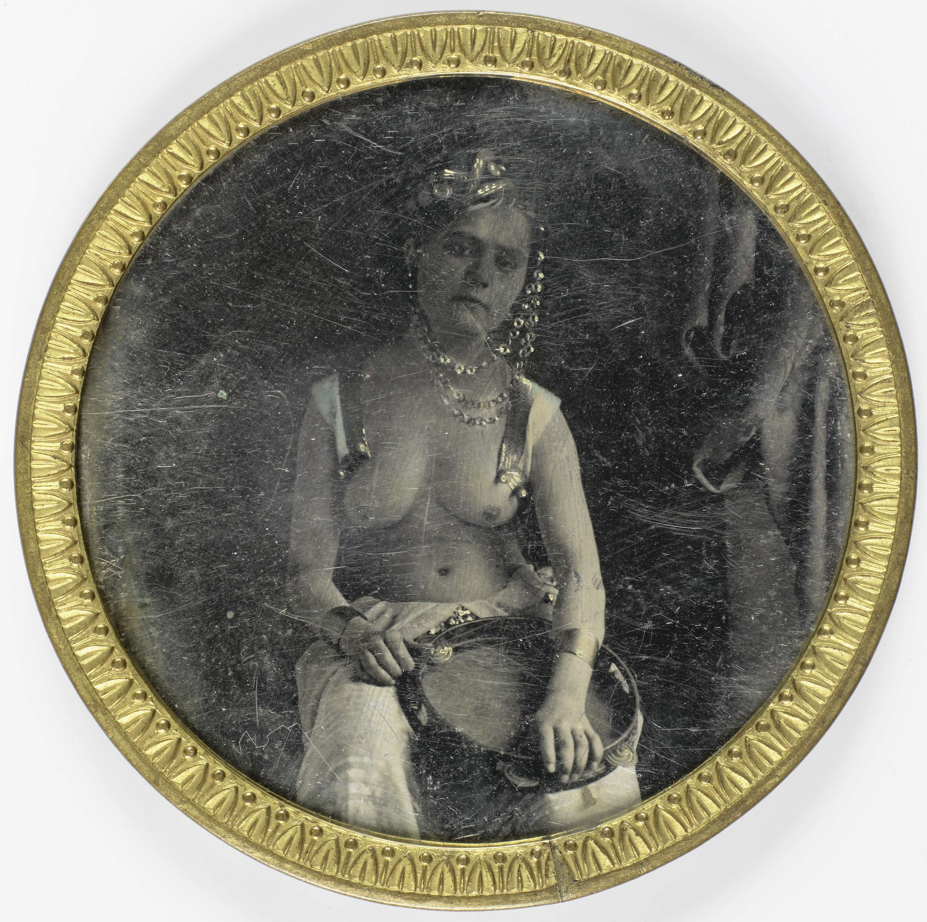 Portret van een onbekende halfnaakte vrouw met tambo...