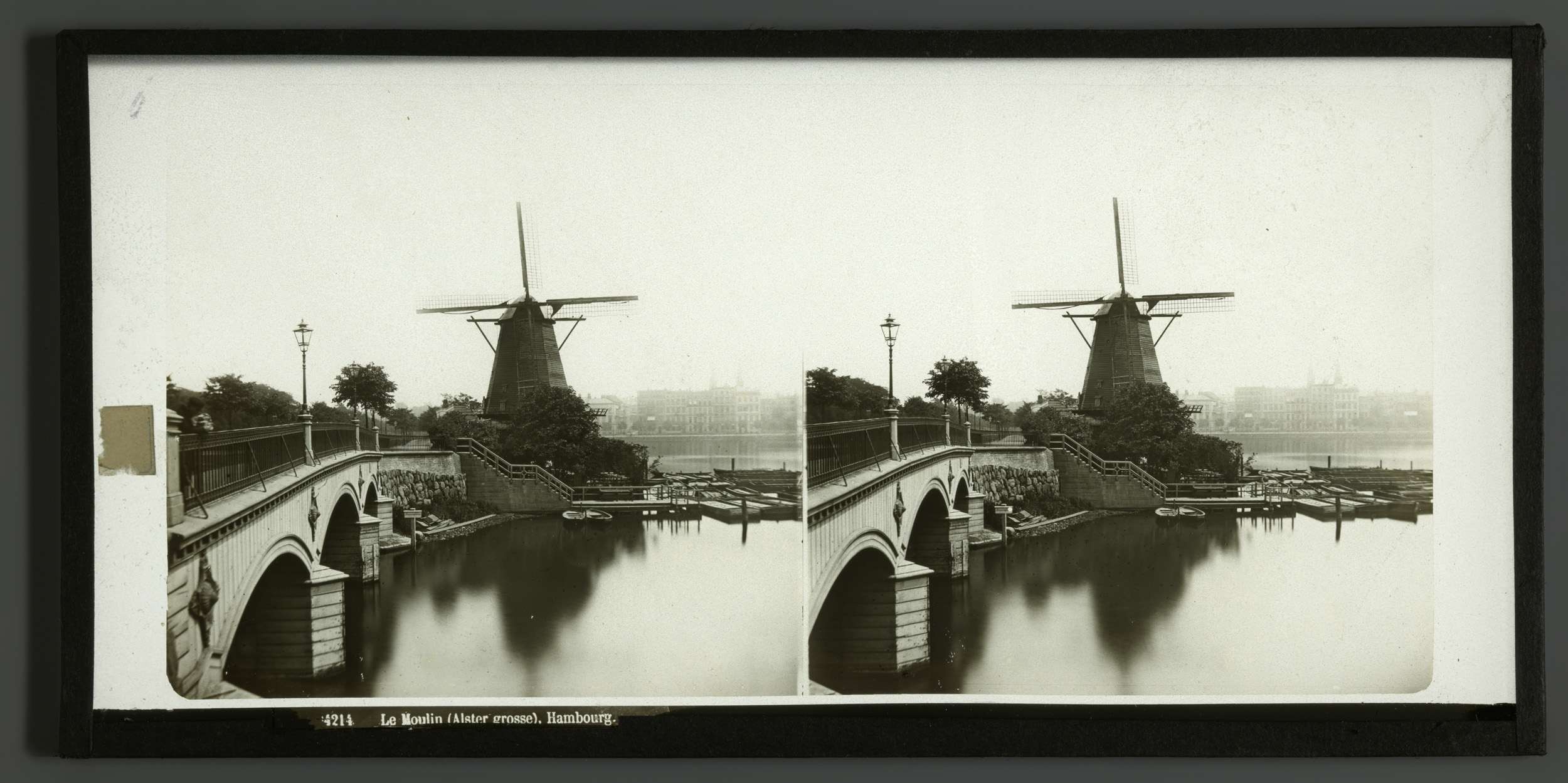 Gezicht op een windmolen aan de Alster bij Hamburg