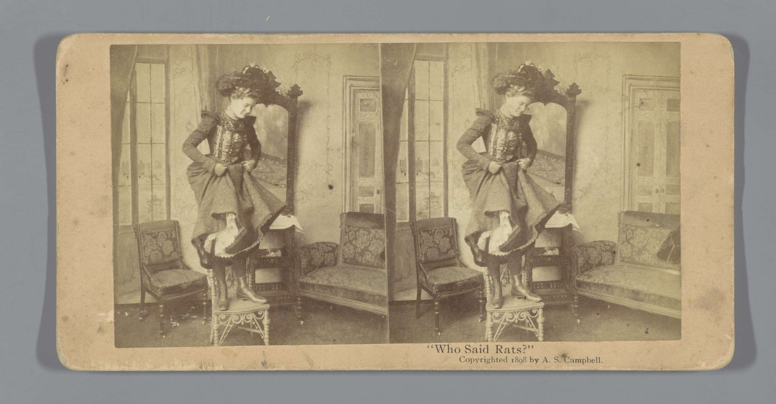 Vrouw staat op stoel en tilt rokken op