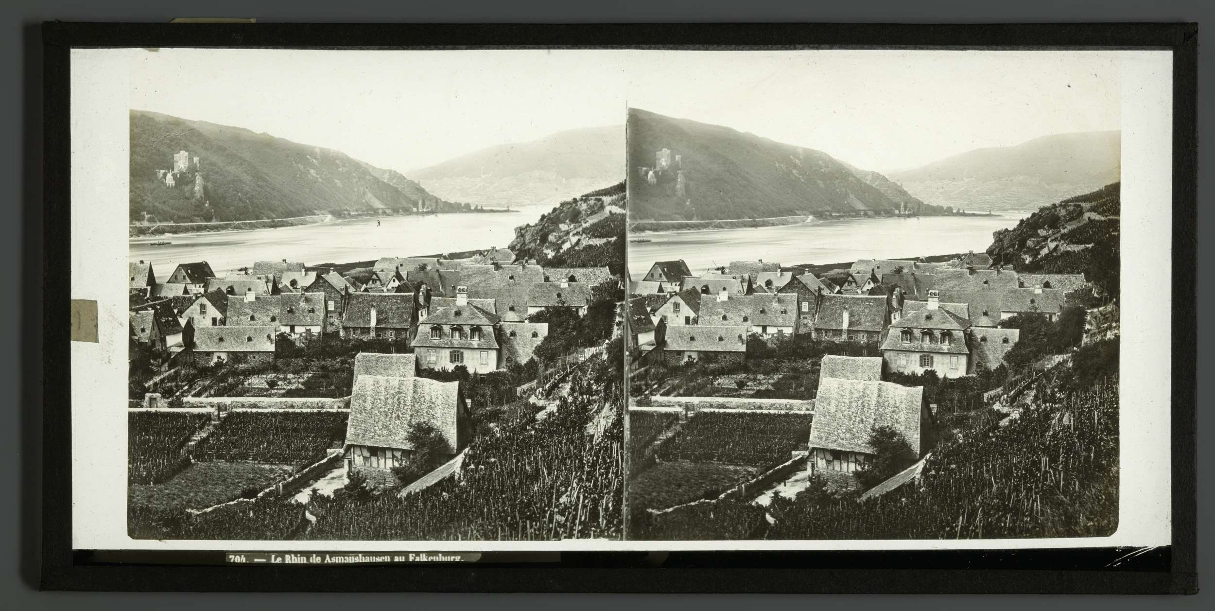Gezicht op Assmannshausen en kasteel Falkenburg, Dui...