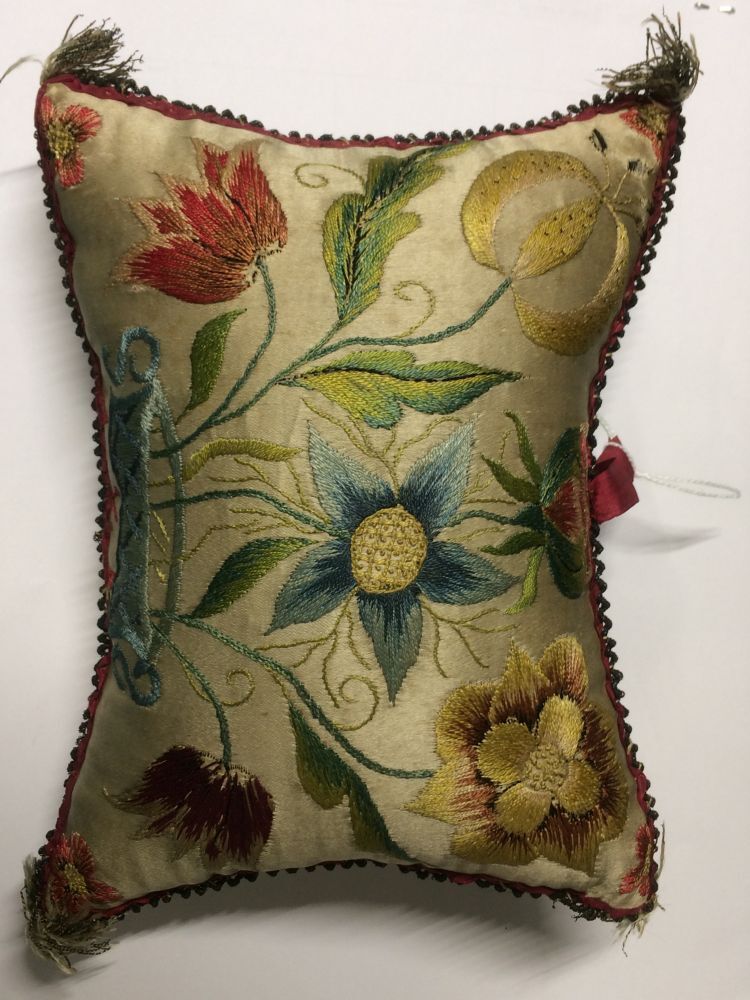Bakerspeldenkussen van satijn waarop bloemenornament...
