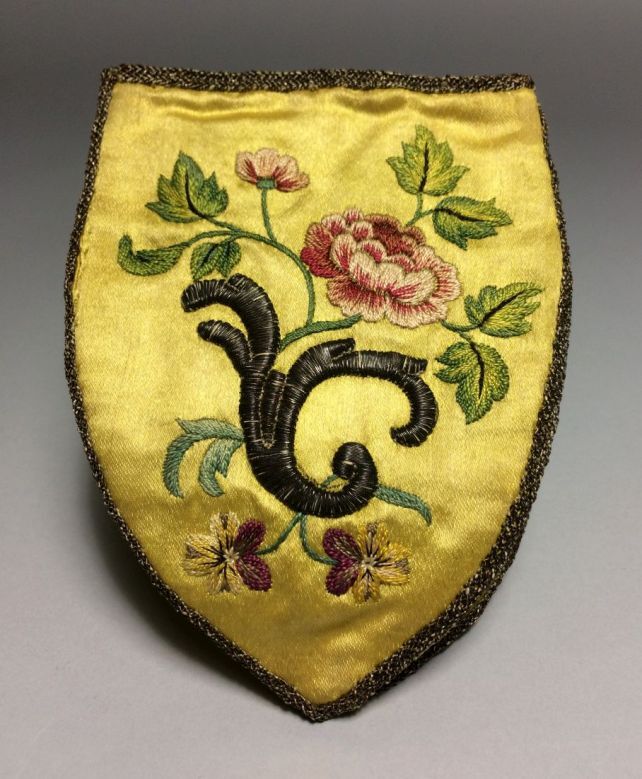 Beursje van gele zijde, geborduurd in ingrijpsteek e...