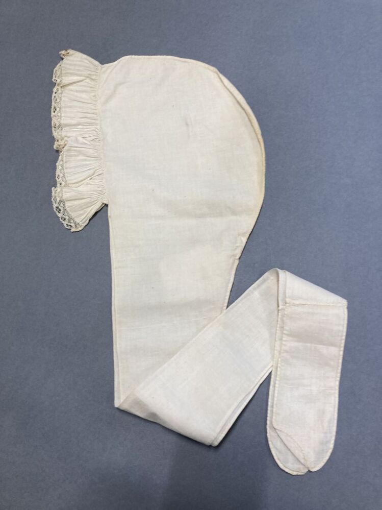 Muts van wit katoen met bandjes, voor afgezet met ge...