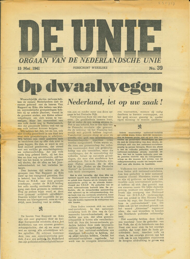 De Unie. 1ste jaargang No 39. 15 mei 1941