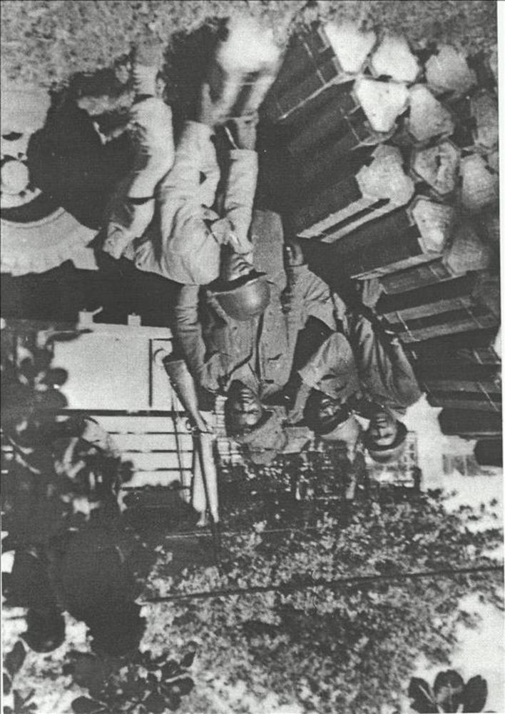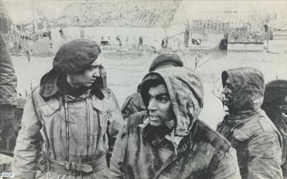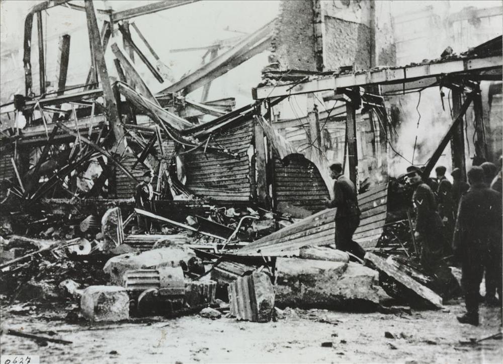 brandweerlieden en duitse militairen bij uitgebrand ...