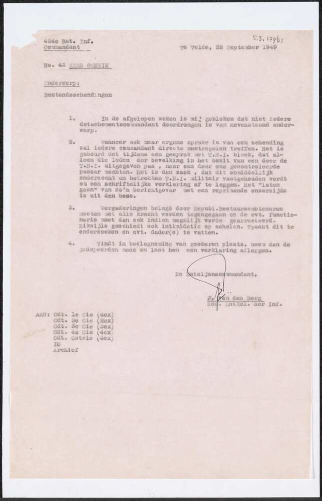 Brief van de commandant 424e Bat. Inf over bestandss...