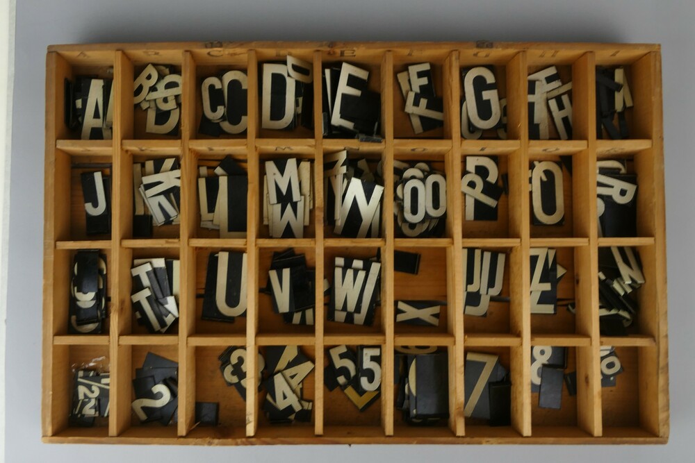 letterdoos van hout met blikken plaatjes.