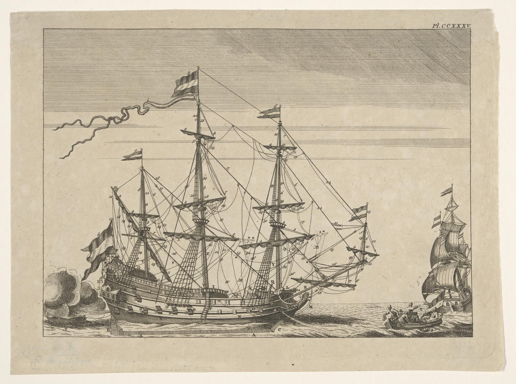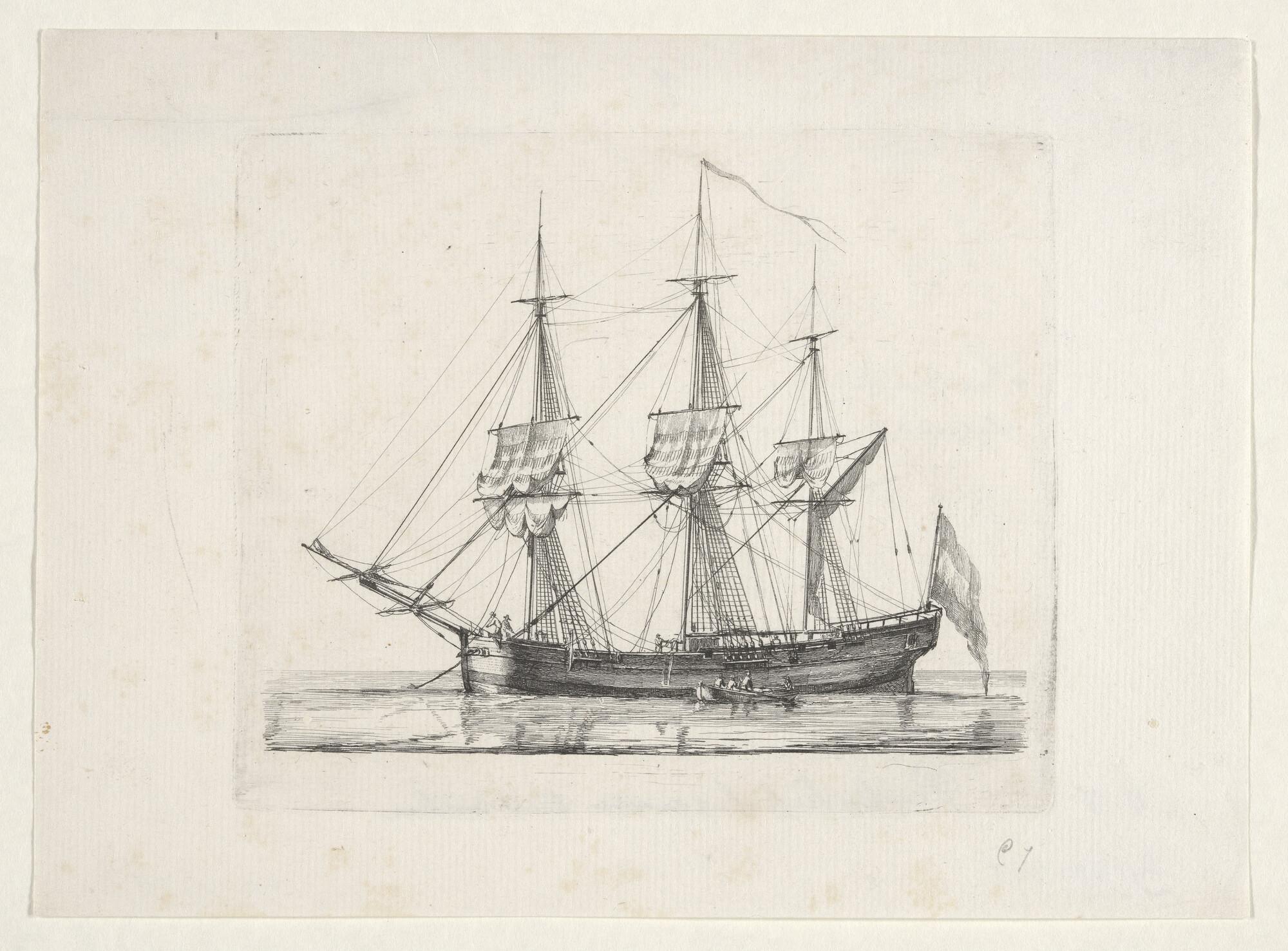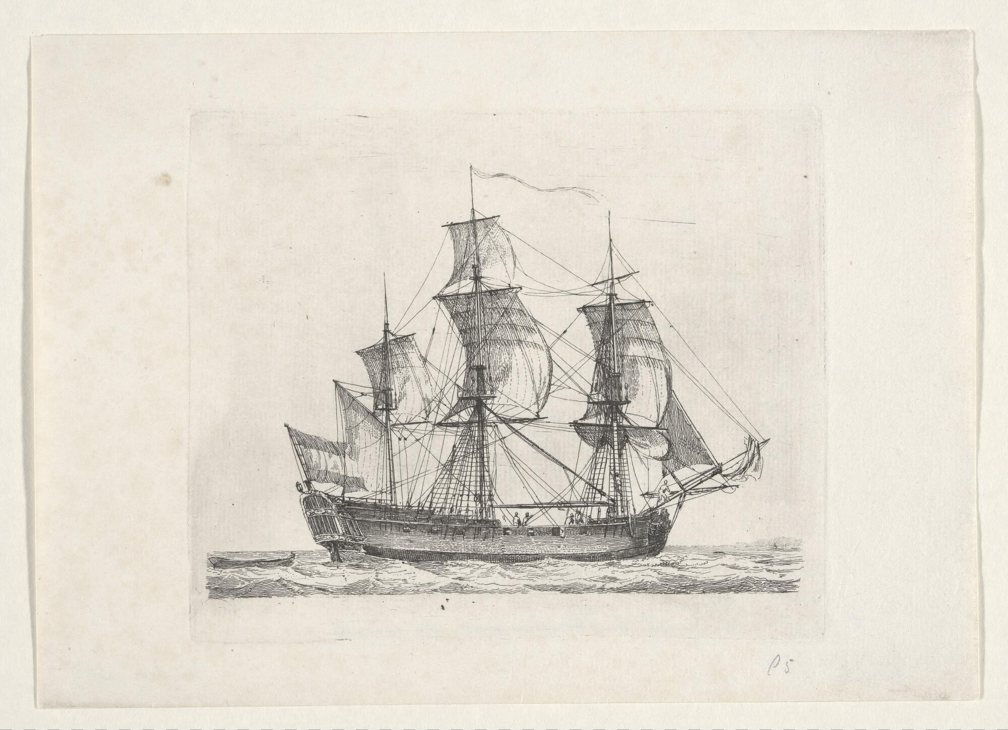 Een driemast oorlogsschip op stuurboordzijde gezien ...