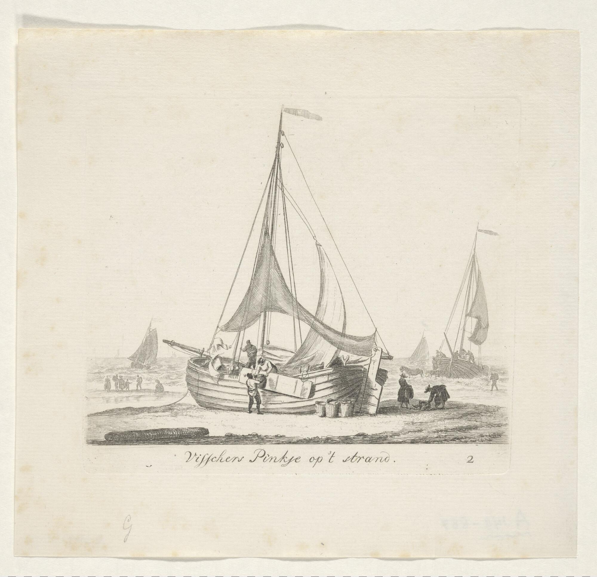 Prent van een visserspink op het strand