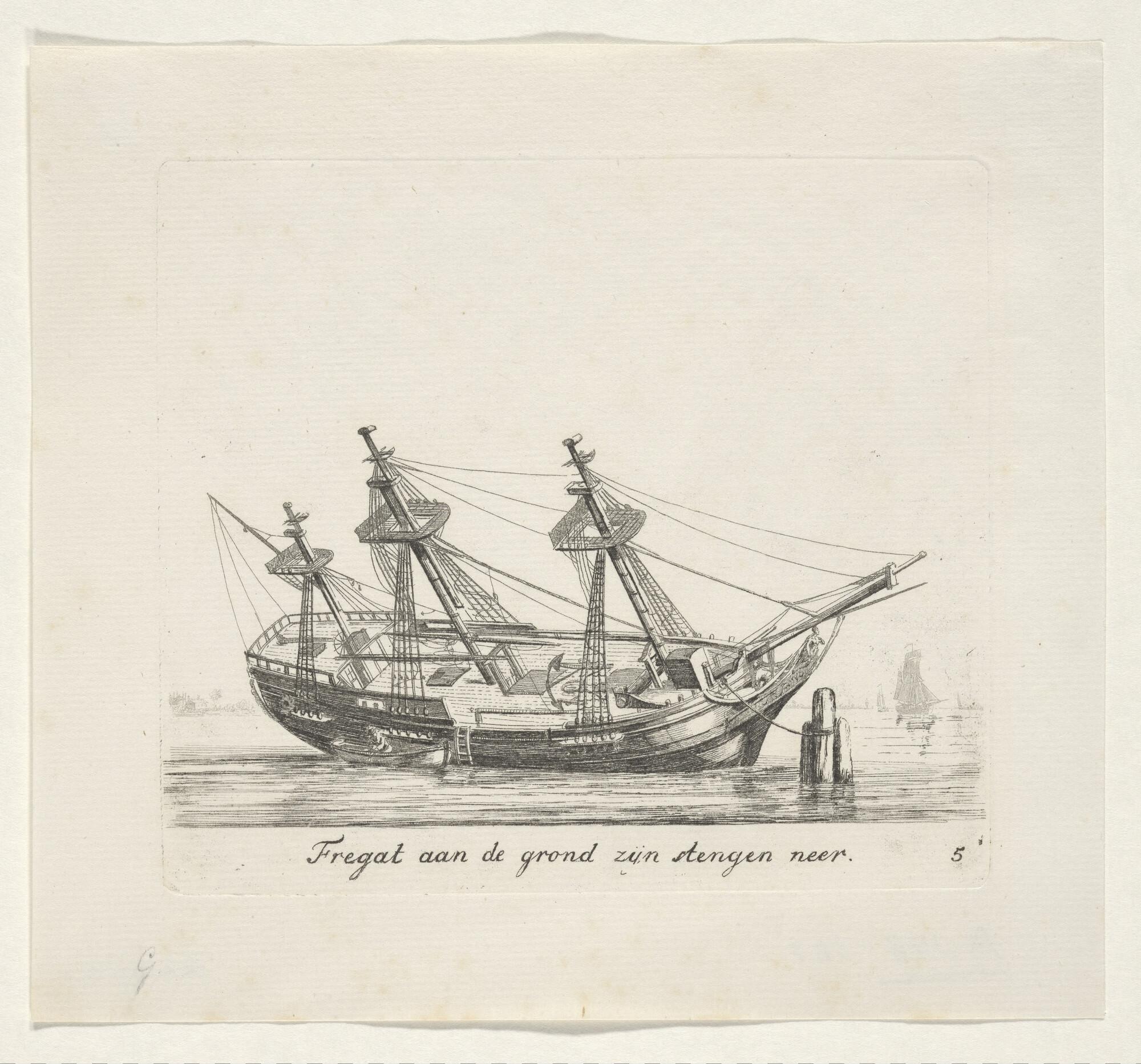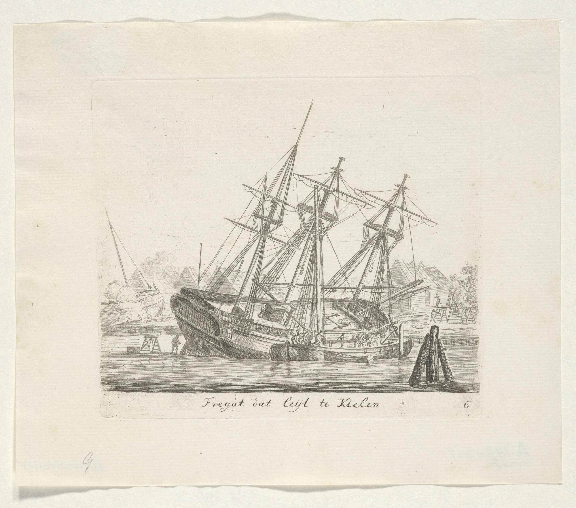 Prent van het kielen van een fregatschip