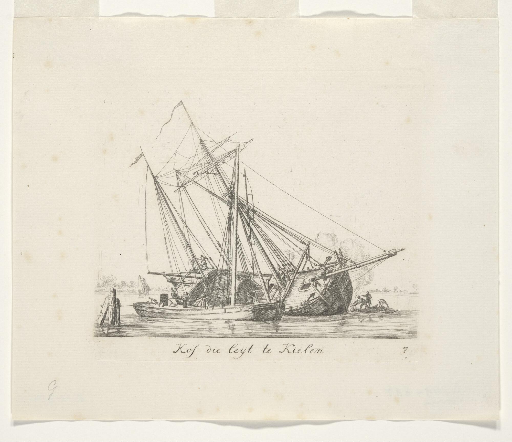 Prent van het kielen van een kofschip