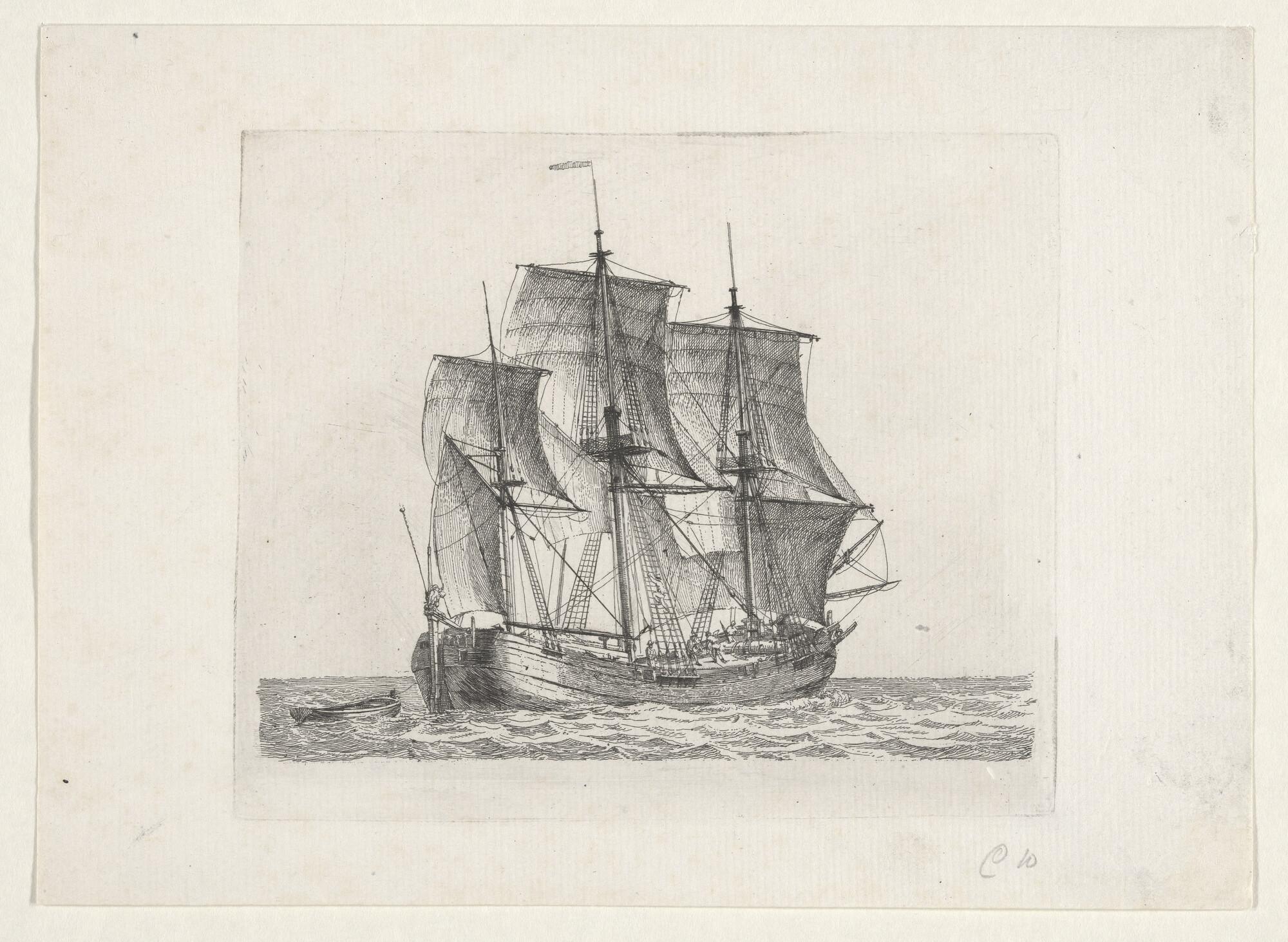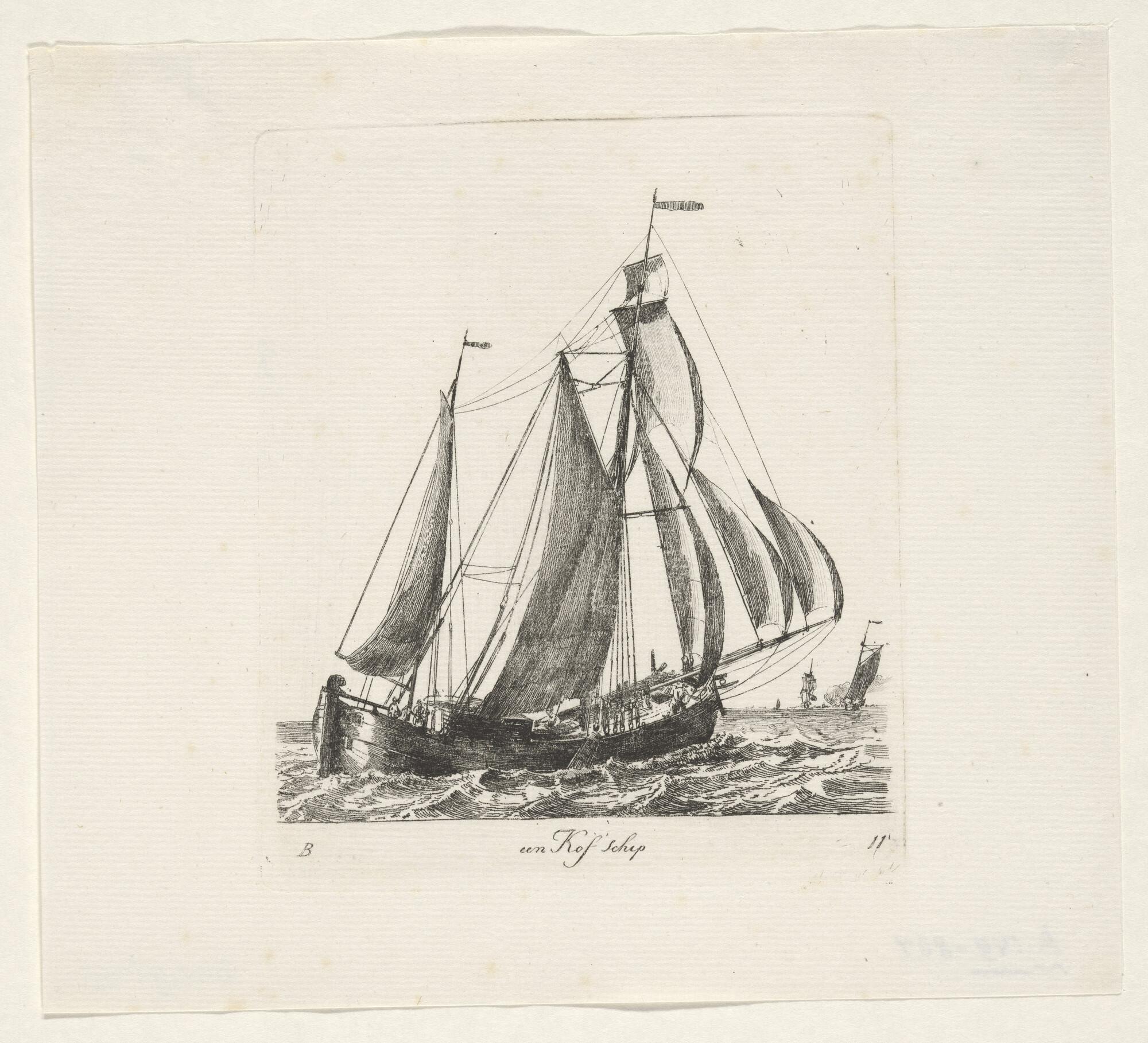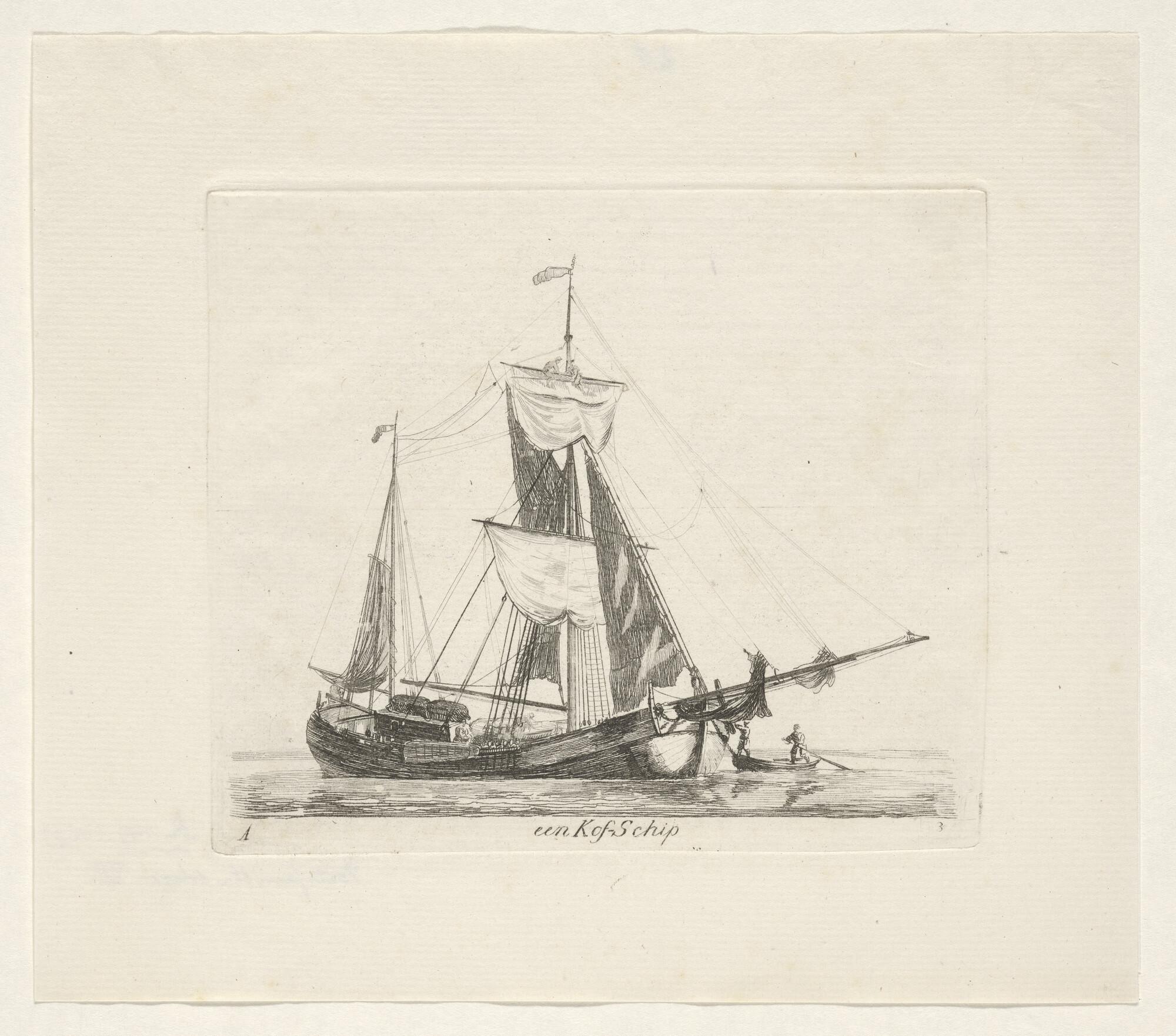 Prent van een kofschip met 1 1/2 masttuig