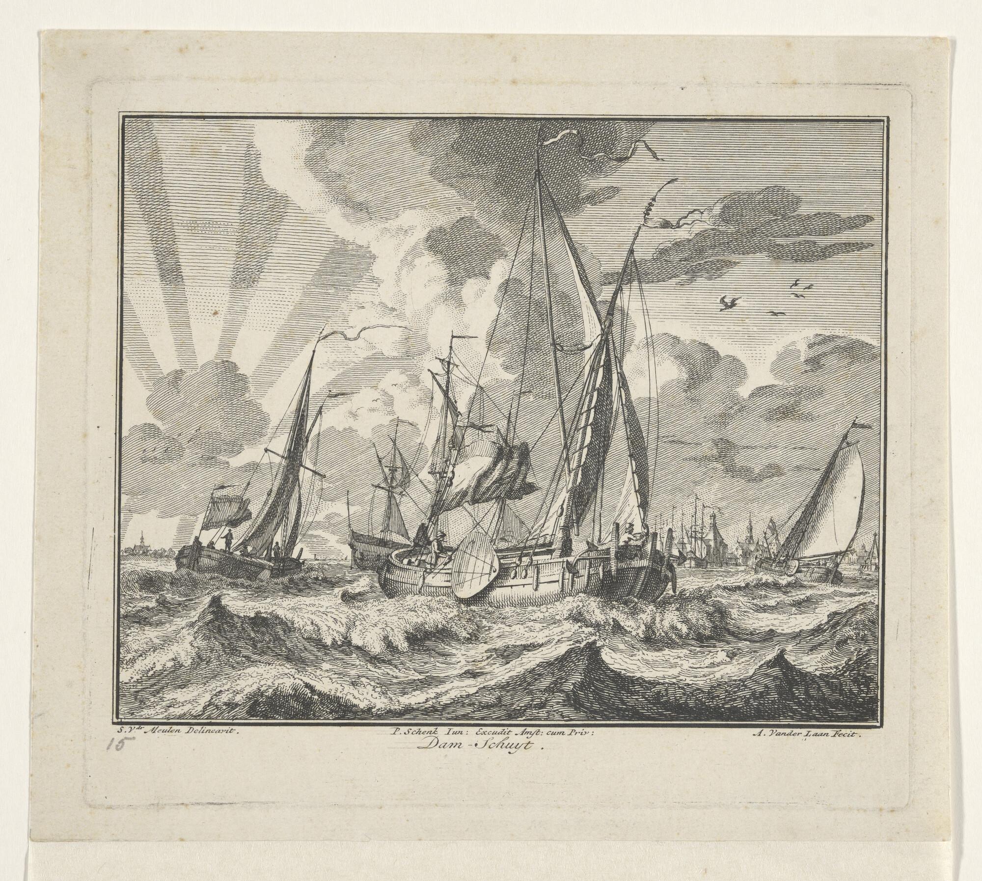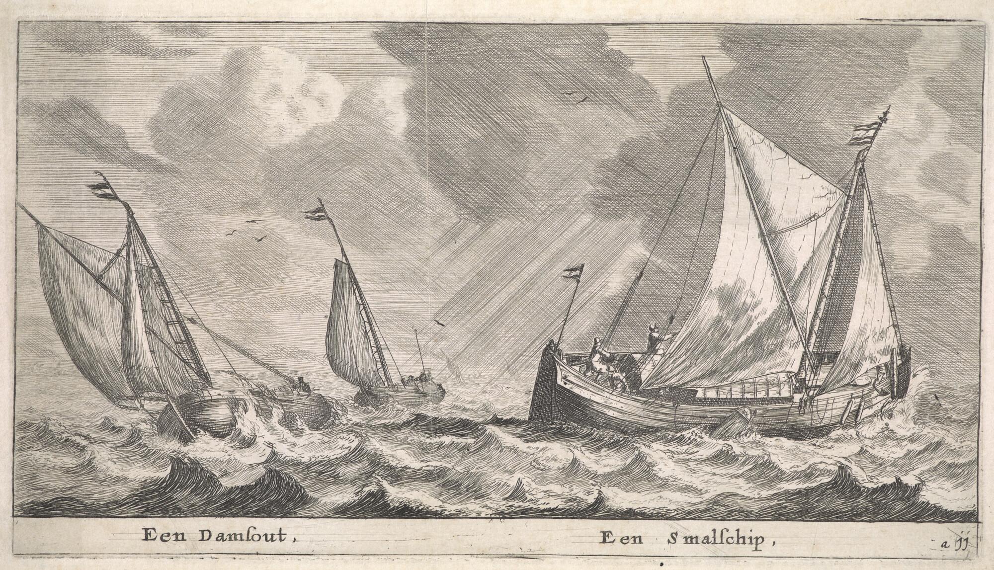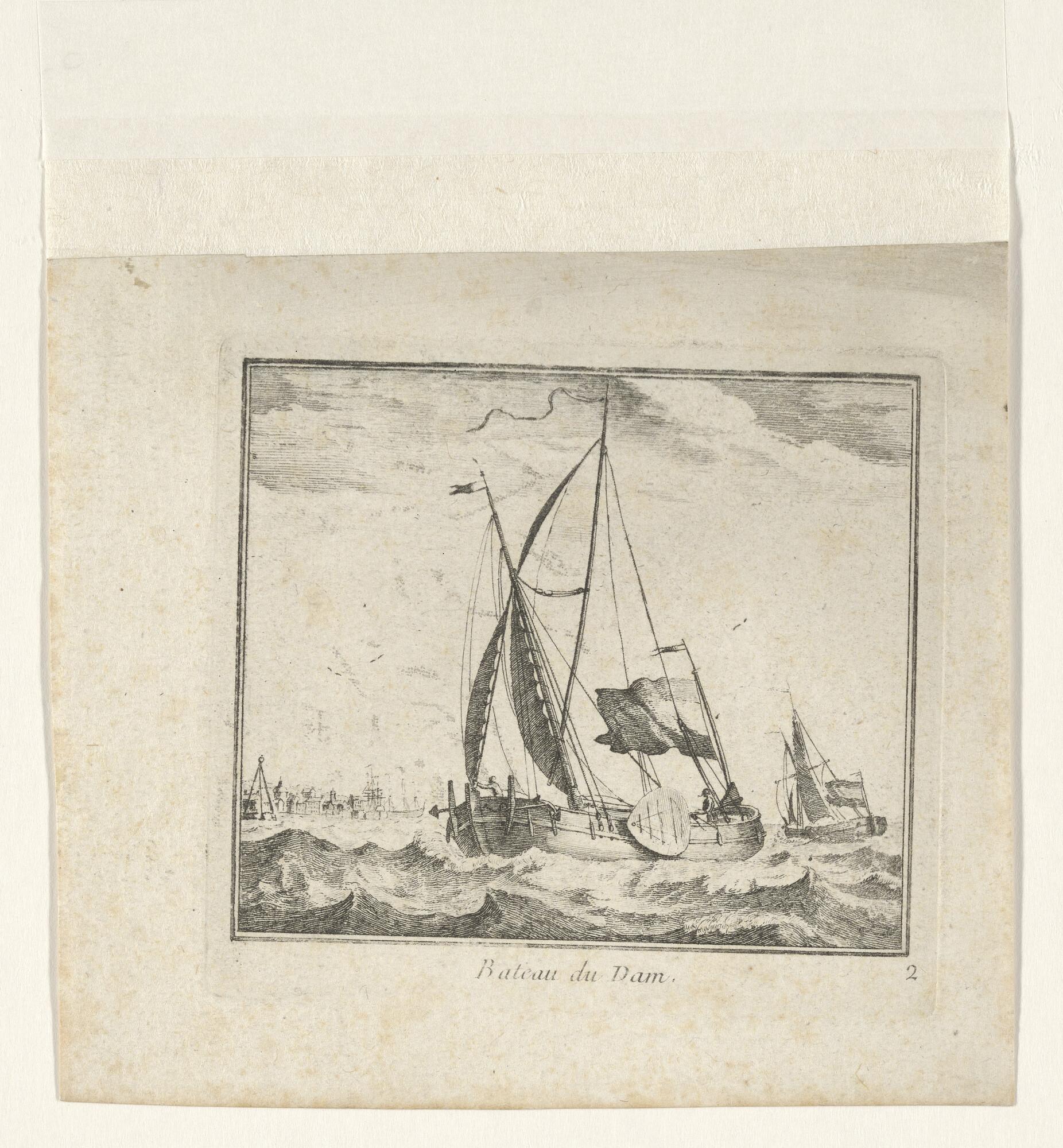 Prent van een damschuit en een smalschip