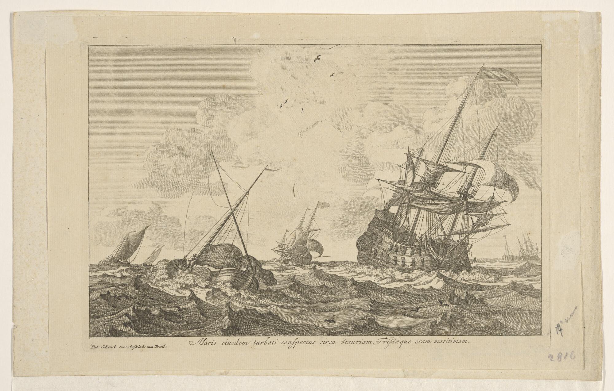 Prent van een driemastschip in stormweer zeilende vo...