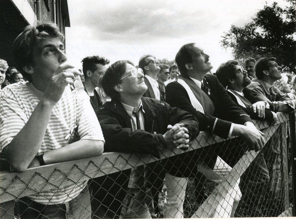 Zwart-wit foto van het koningsschieten bij een Schut...