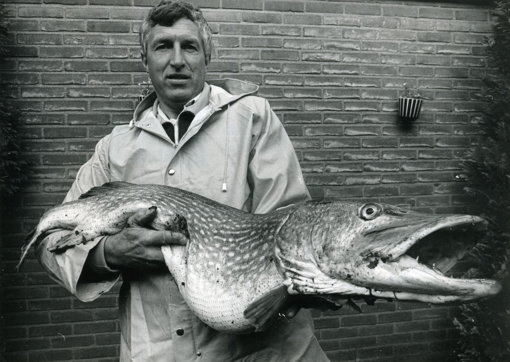 Zwart-wit foto van de vangst van een reuze snoek in ...