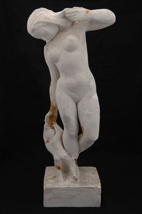 Ontwerp in gips voor natuurstenen beeld, voorover ge...