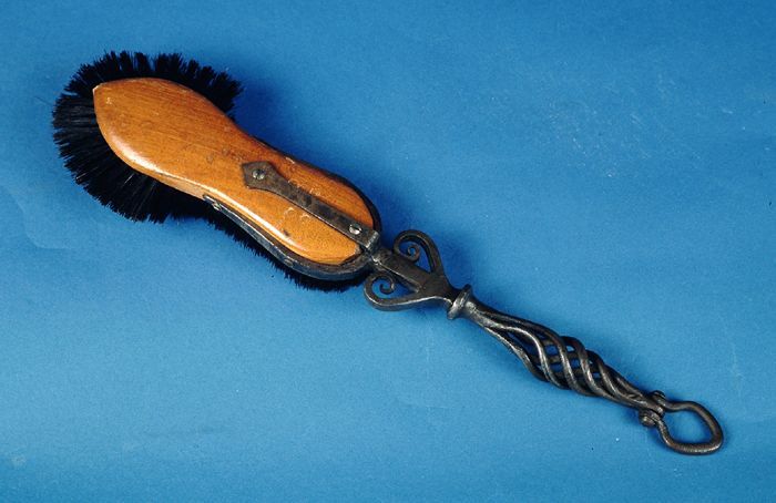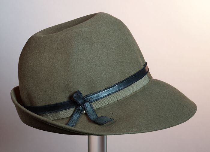 Dameshoed van bruin haarvilt, zwart leren bandje met...