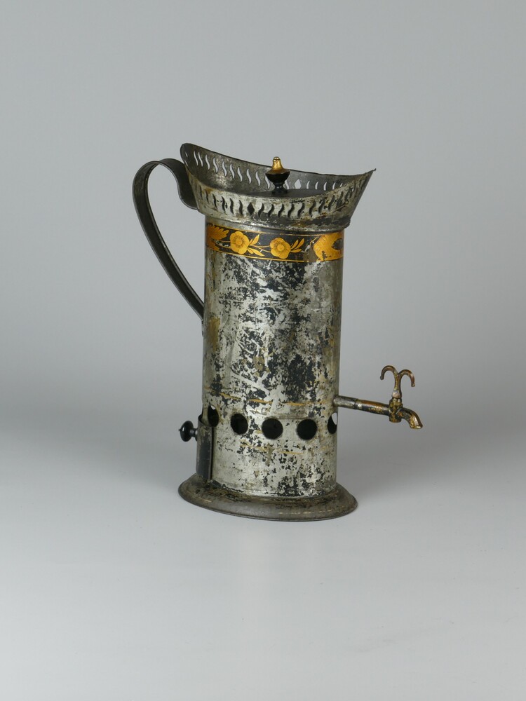 Kan met deksel, kraantje en schuifje voor kooltjes.