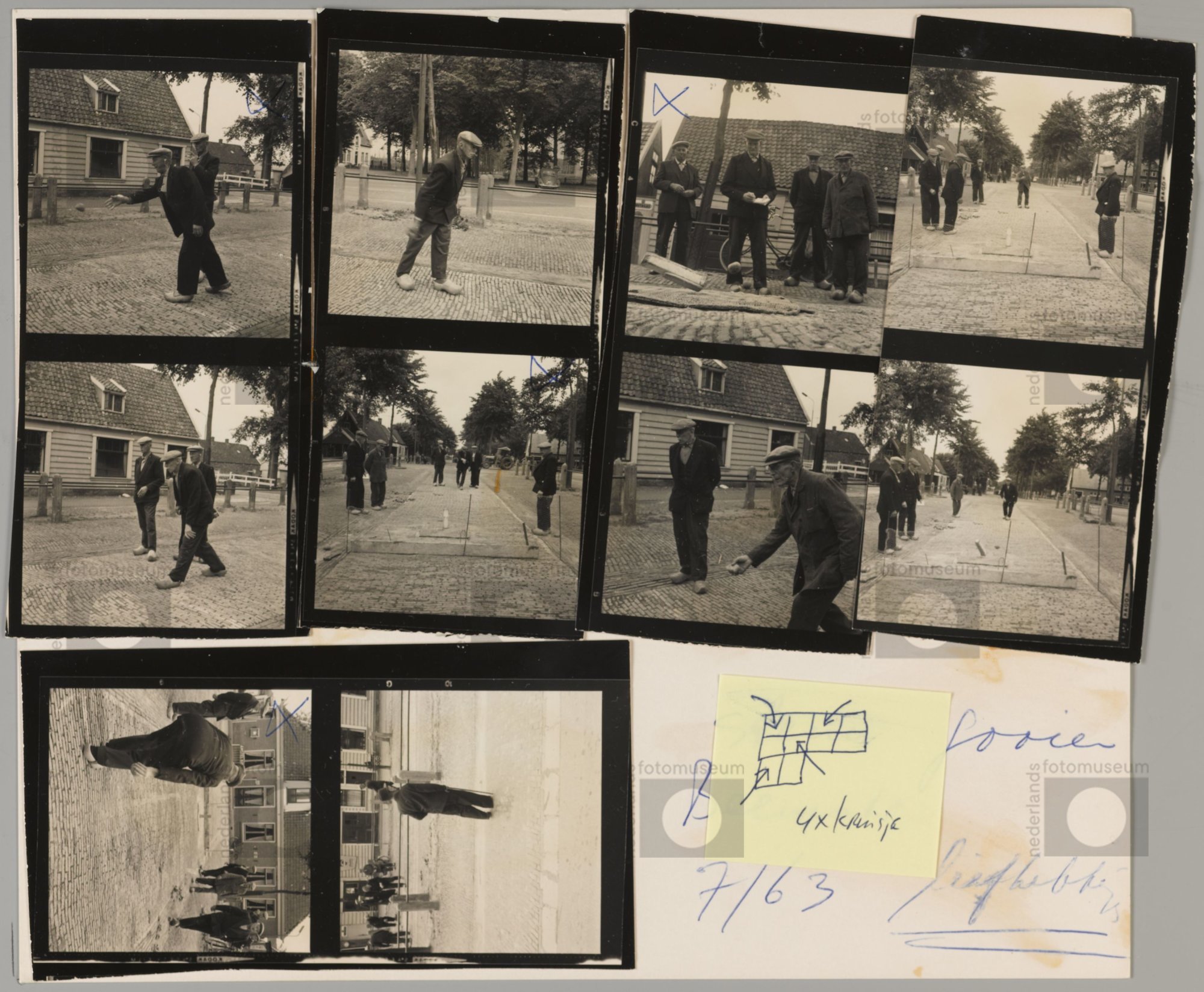 Beemster. Mannen spelen op straat met elkaar een spe...
