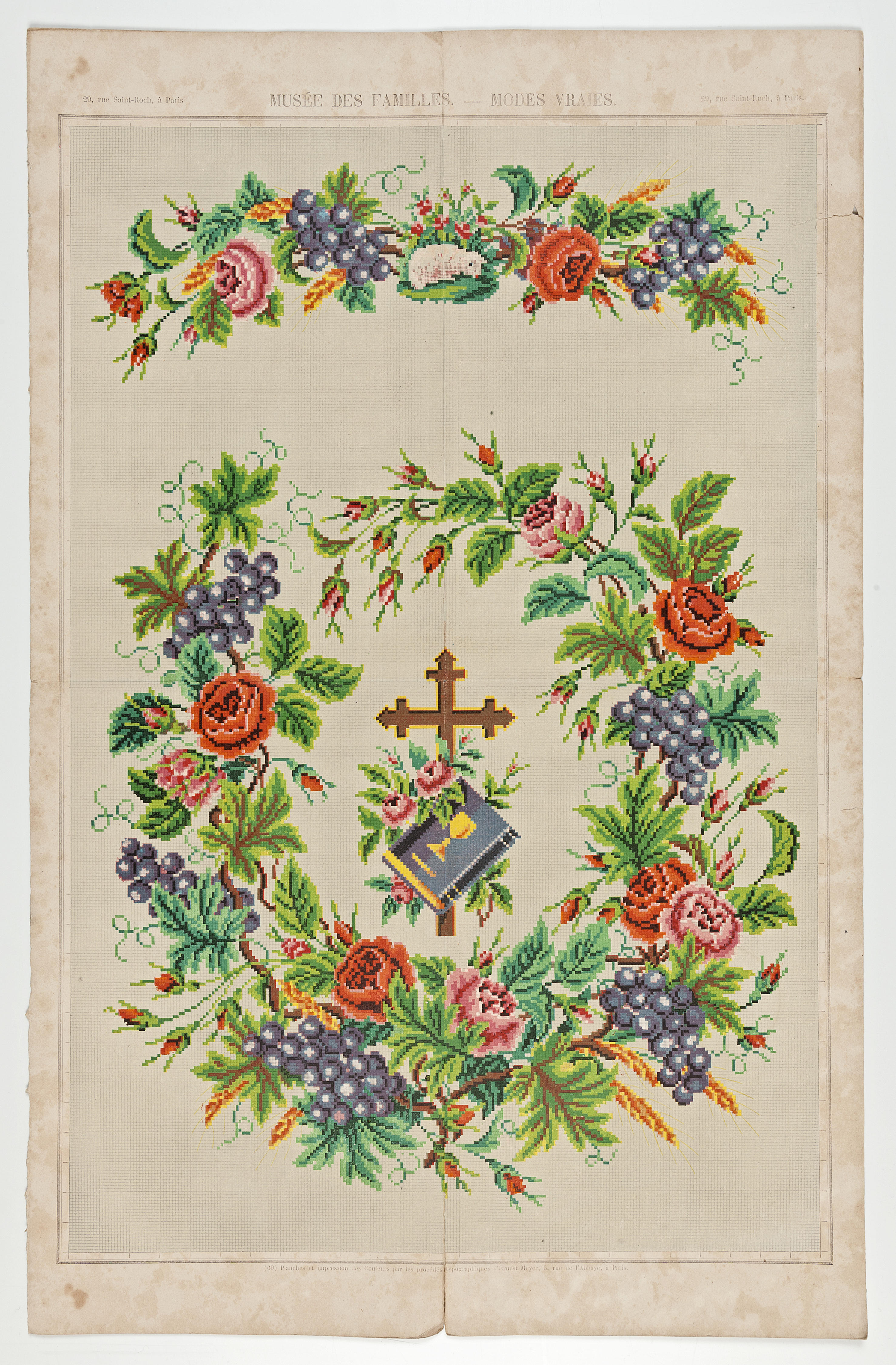 Borduurpatroon met bloemenrand en kruis met boek, Pa...