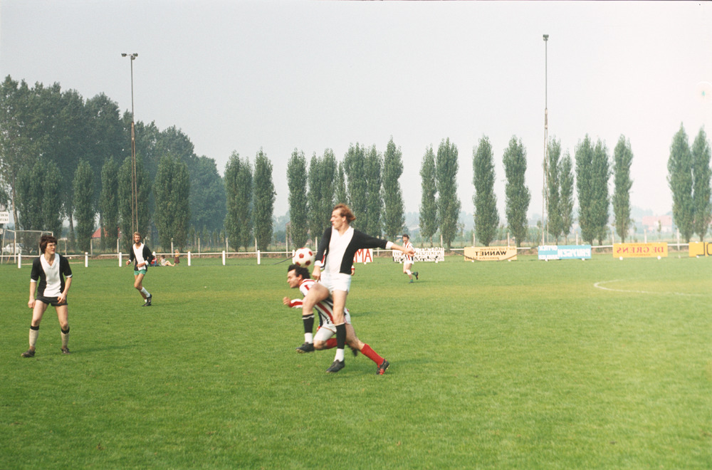 Kleurendia van vijf voetbalsters zittend op het veld...