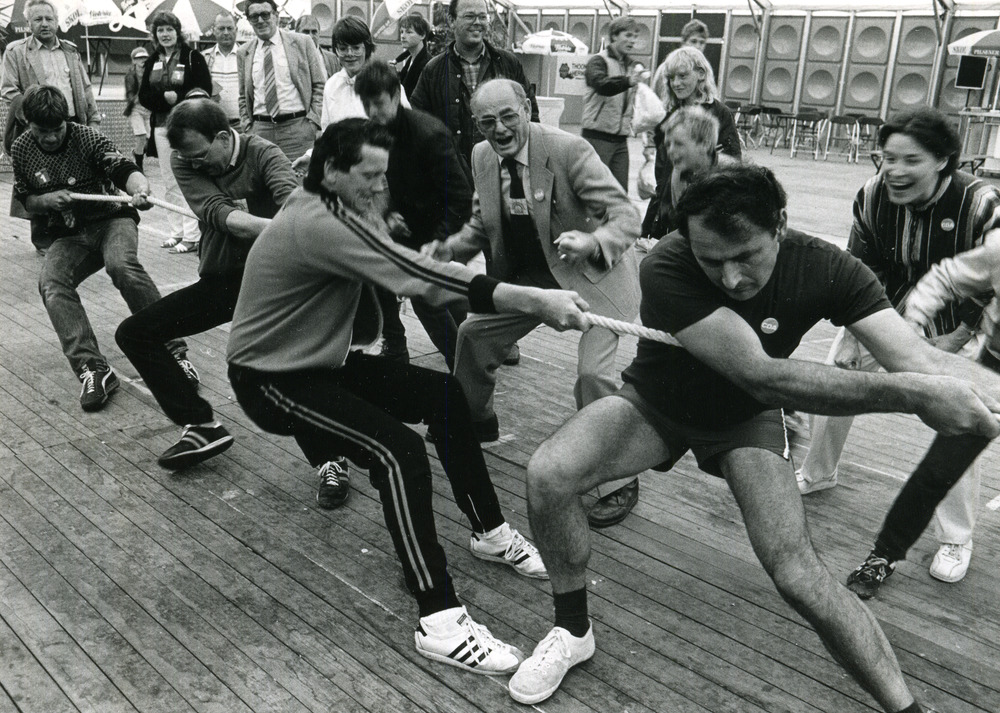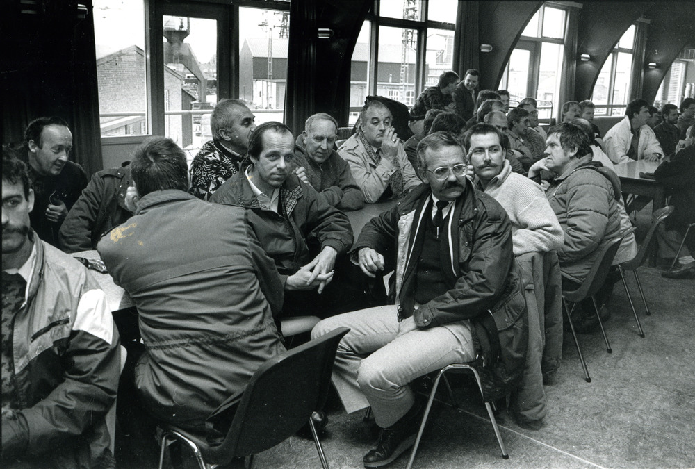 Zwart-wit foto van een stakingsactie bij scheepswerf...