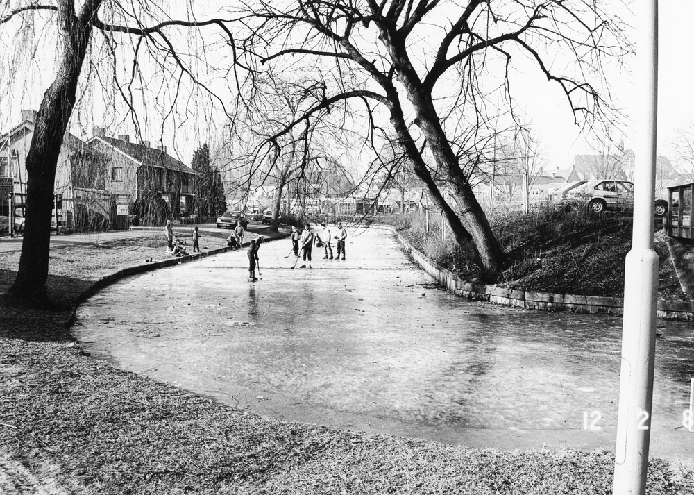 Dichtgevroren Friese Gracht met ijshockeyspelers op ...