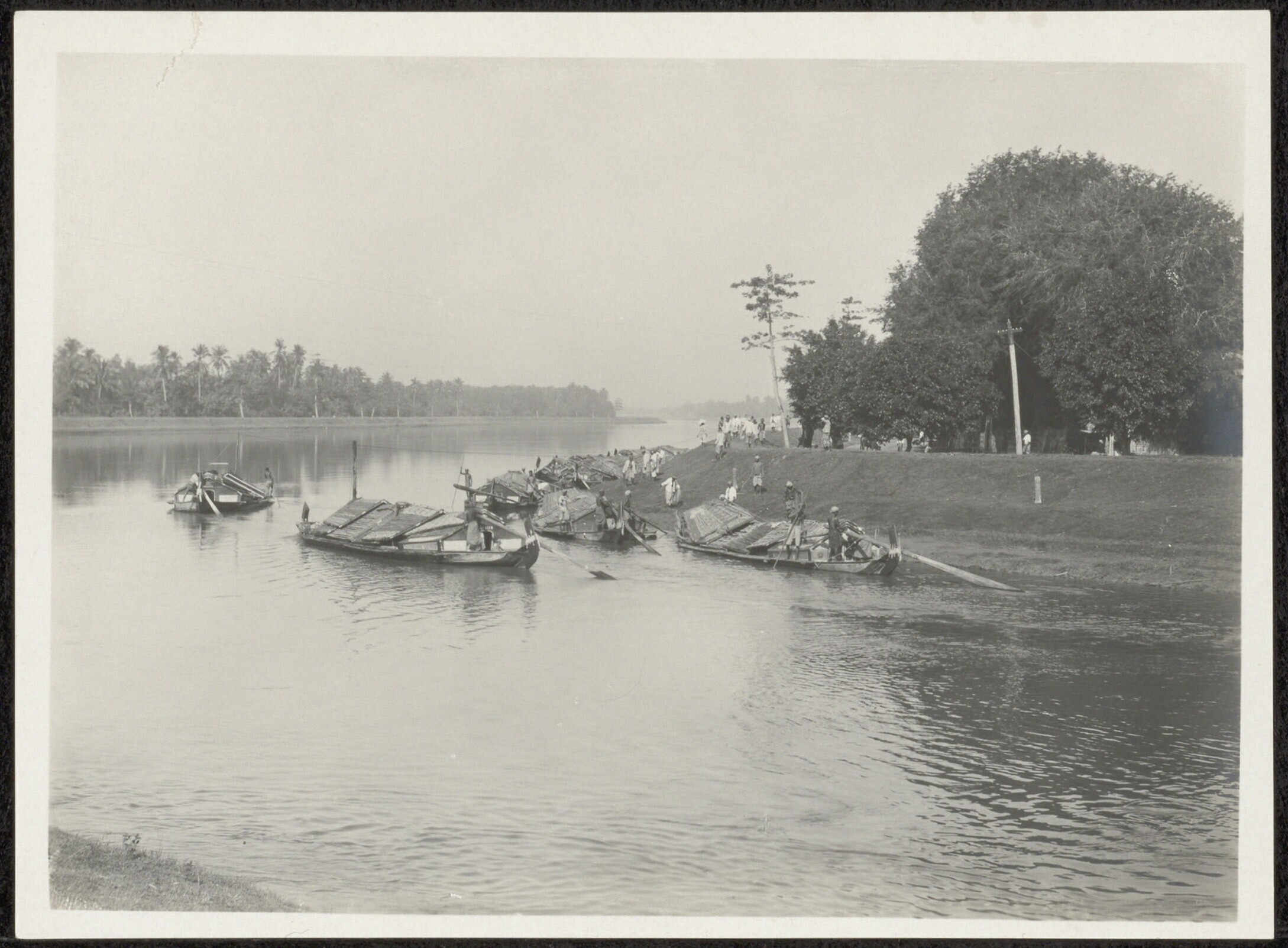 Prauwen bij een bocht in de rivier Brantas, Modjokerto