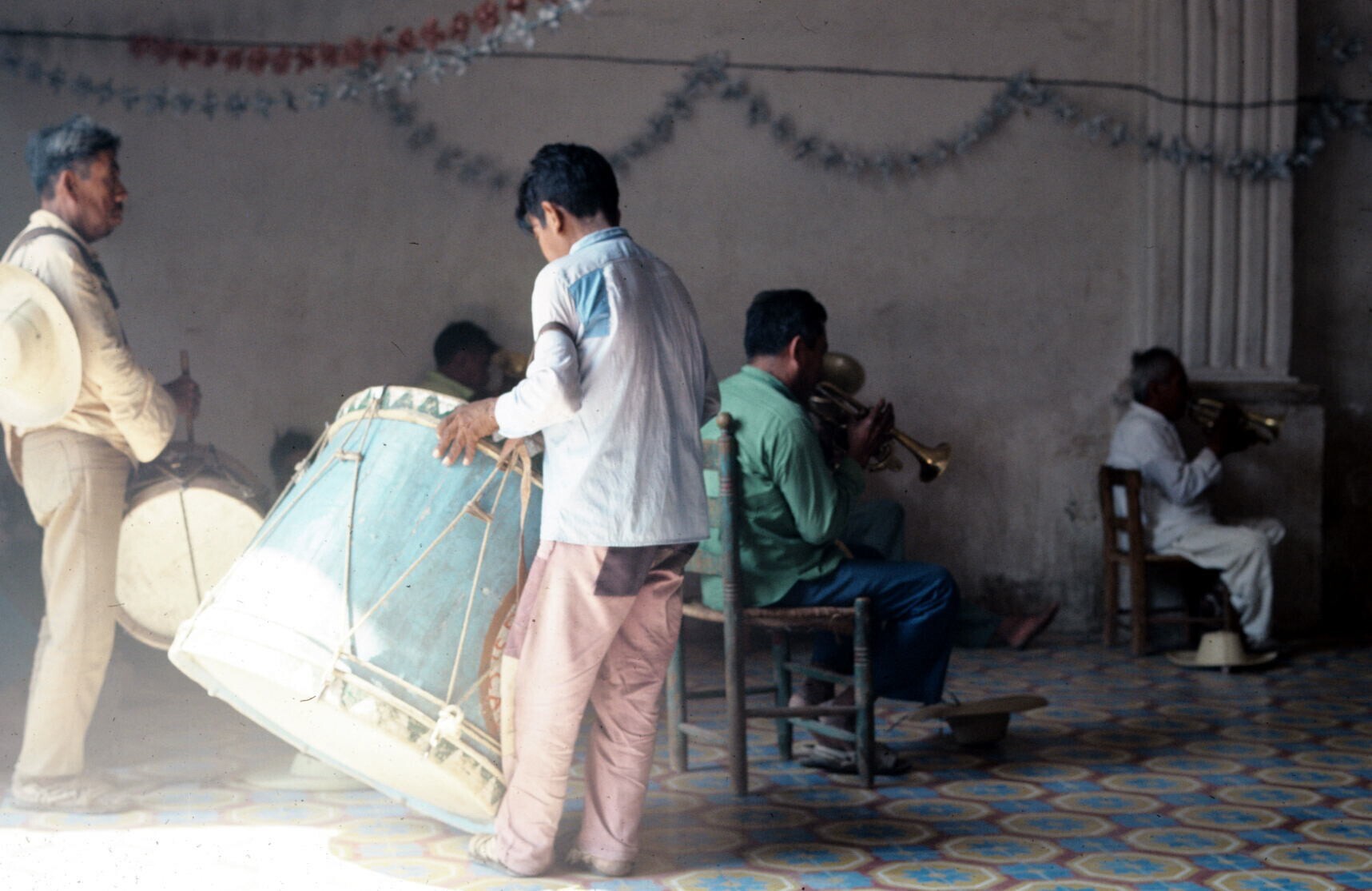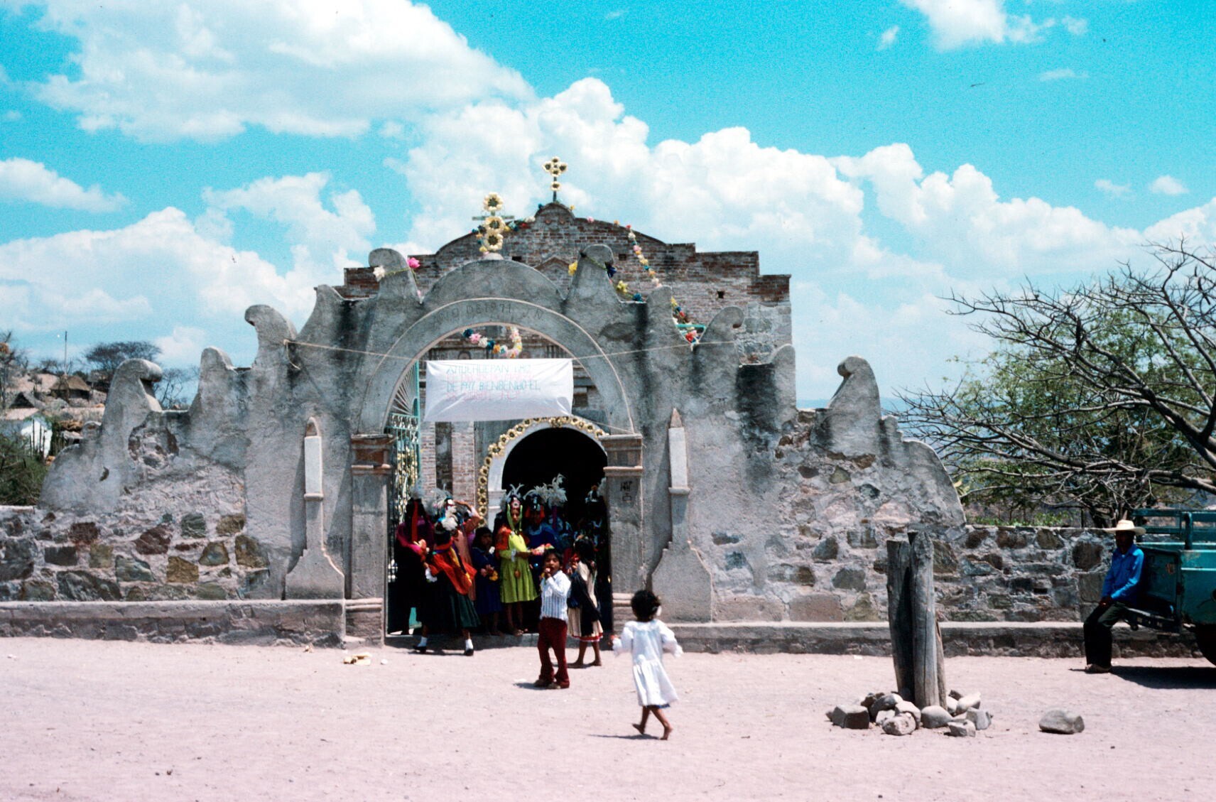 versieringen bij kerk; op voorgrond: Angel Juárez