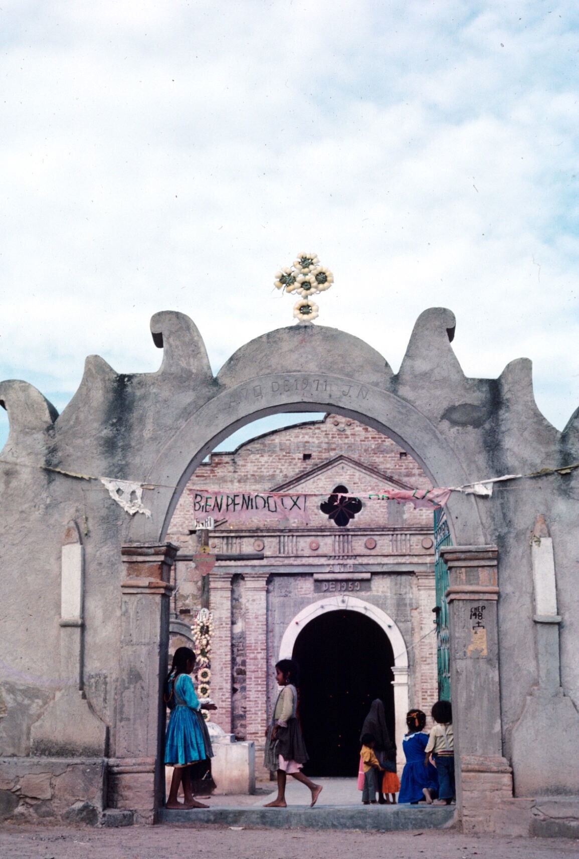 ingang kerk met spandoek 'bienpenido' (sic)