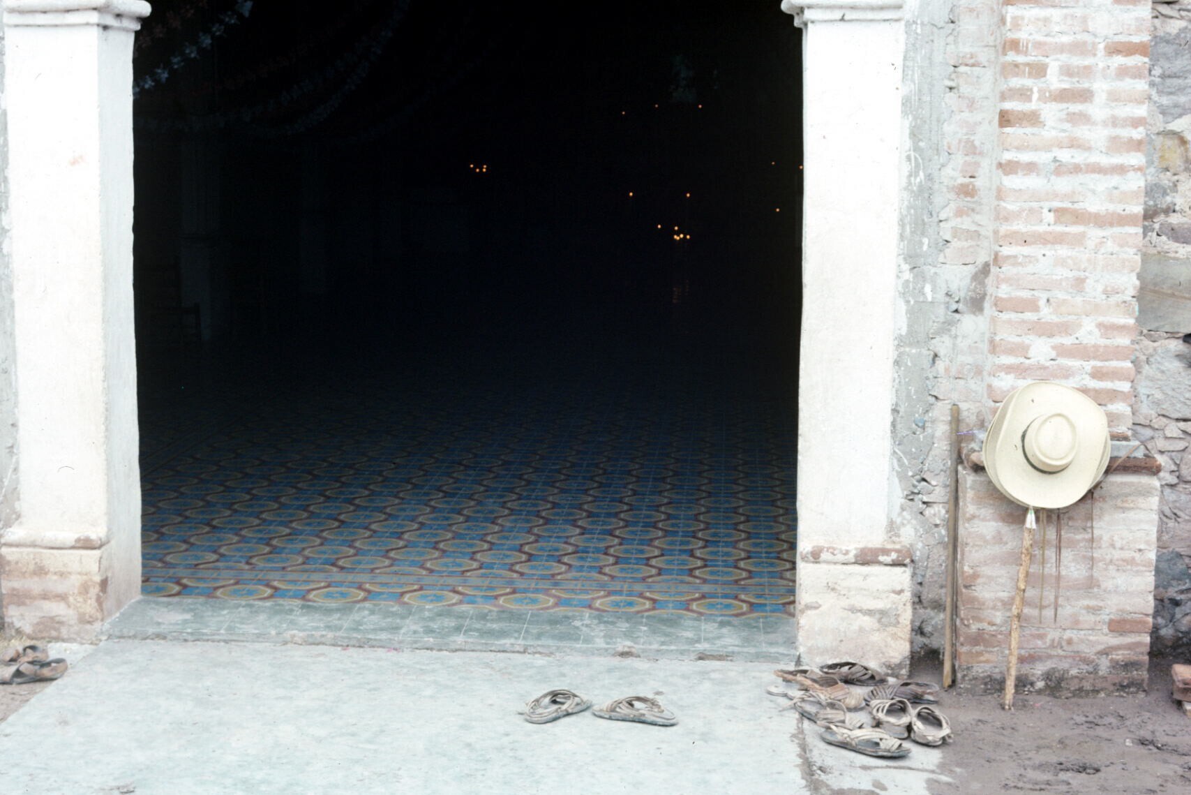 bij kerkdeur door kerkgangers achtergelaten sandalen...