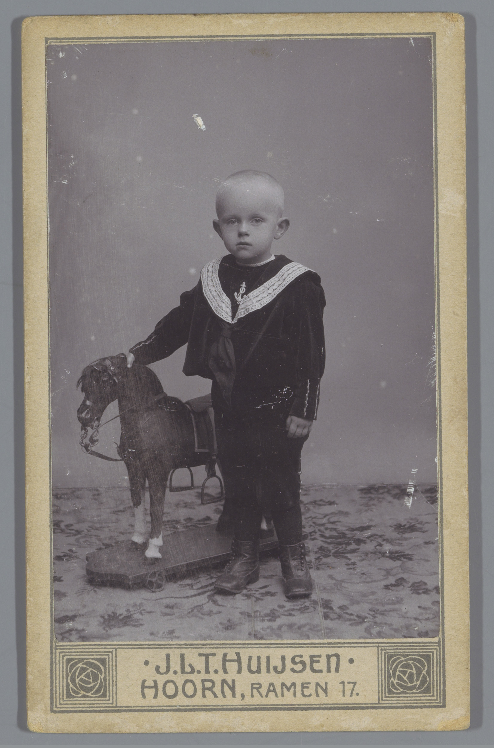 Portret van Almer Middelbeek naast een speelgoedpaard