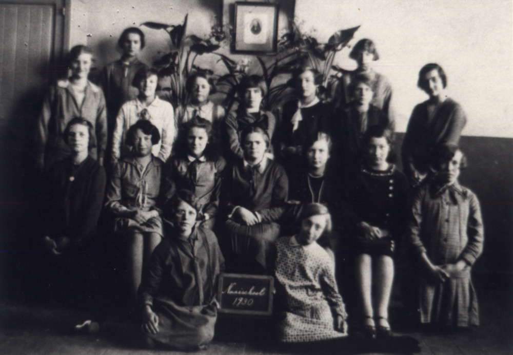 Zwart-wit foto van de naaischool in Herwen 1930