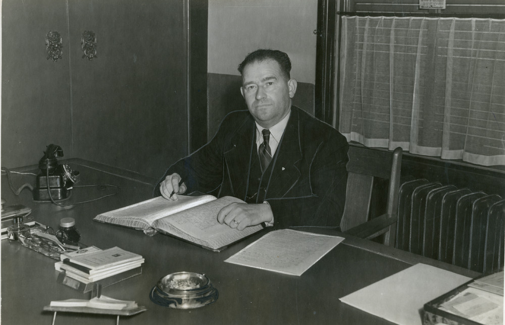 Zwart-wit foto van de heer Mulder gemeentesecretaris...