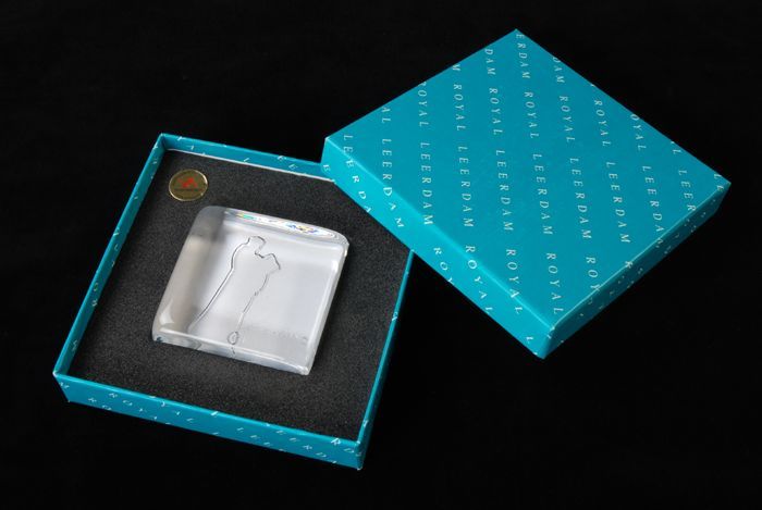 Glazen presse-papier met in reliëf aan de onderzijde...