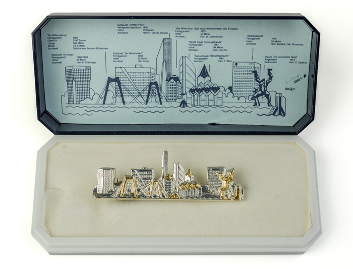 Dasspeld met verzameling Rotterdamse gebouwen in zil...