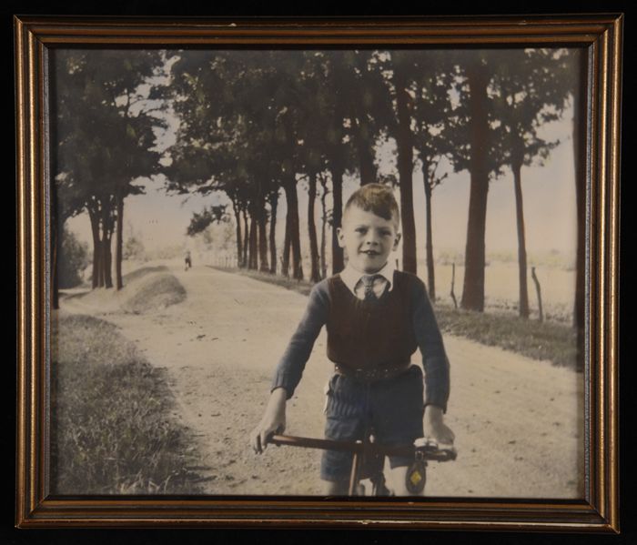 Ingekleurde foto achter glas in goudkleurige lijst, ...