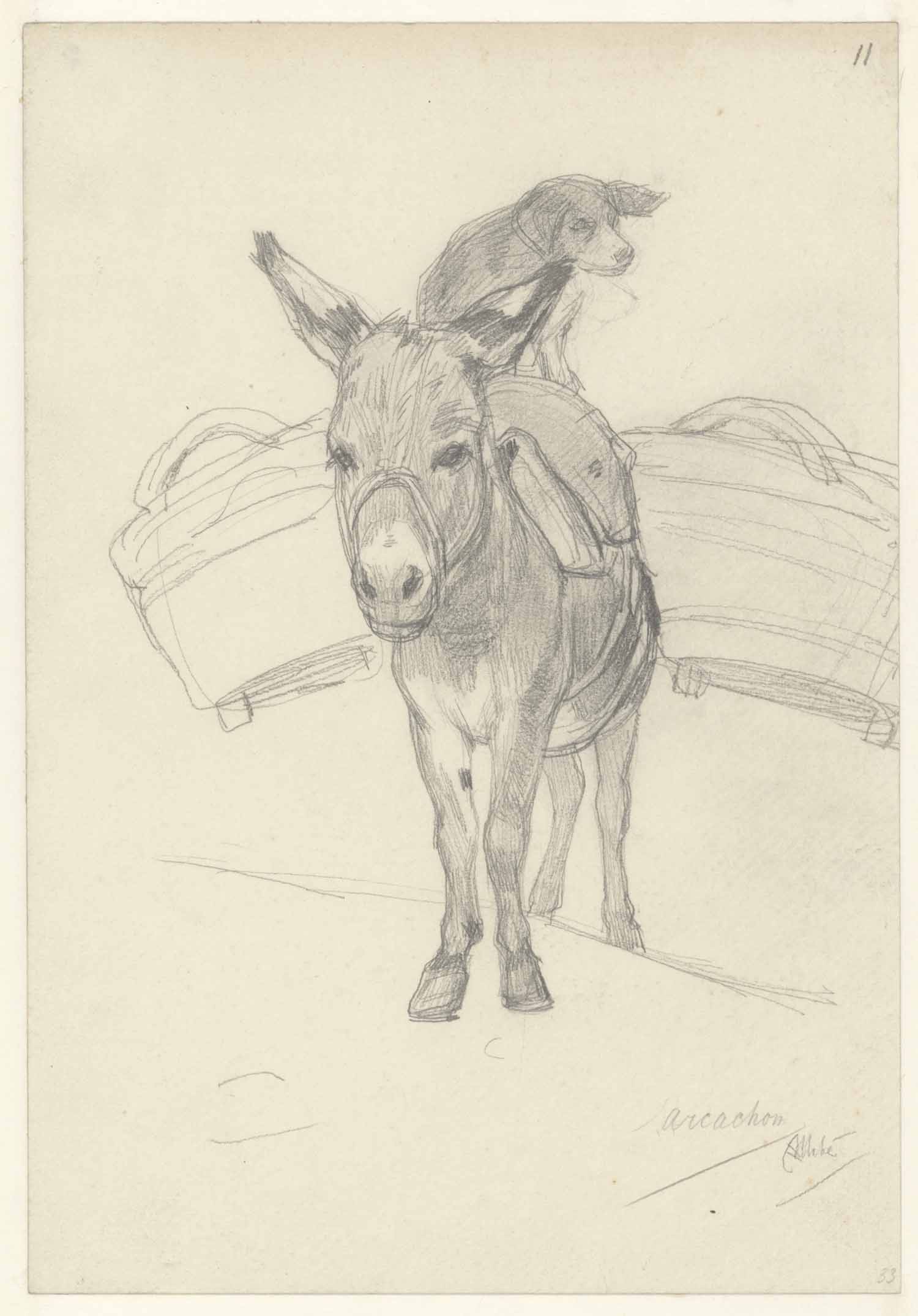 Ezel met hond op zijn rug en twee manden