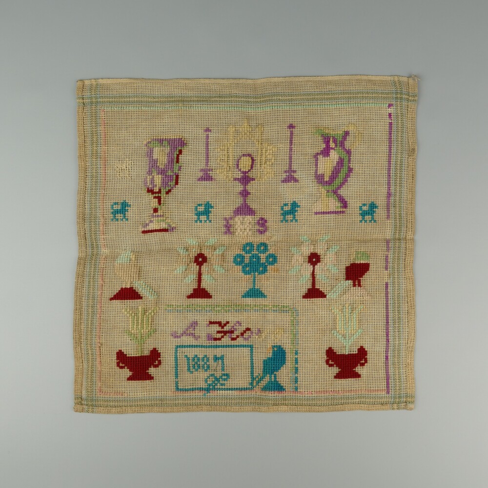 Merklap van linnen stramien met wol geborduurd in kr...