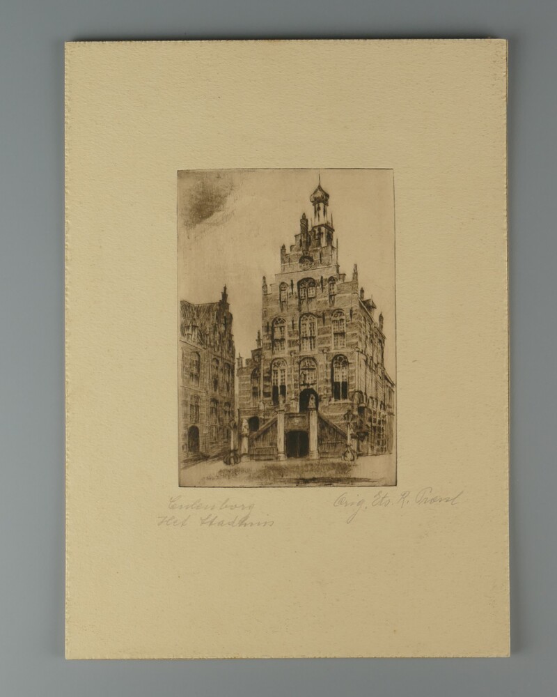 ets, voorstellende het stadhuis aan de Markt te Cule...