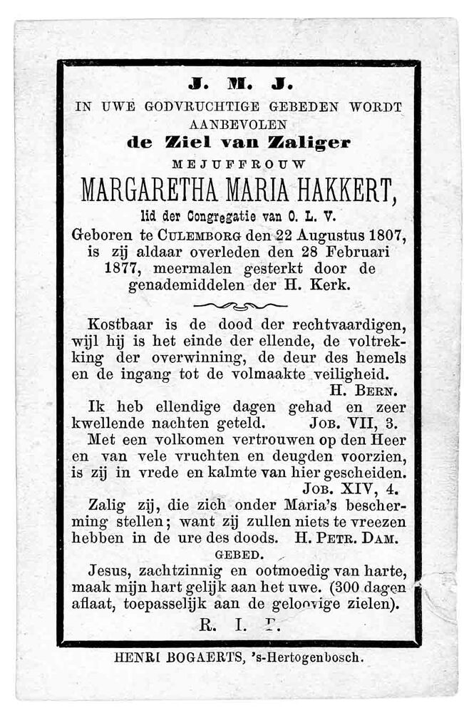 bidprent voor Margaretha Maria Hakkert. Geboren 22-0...