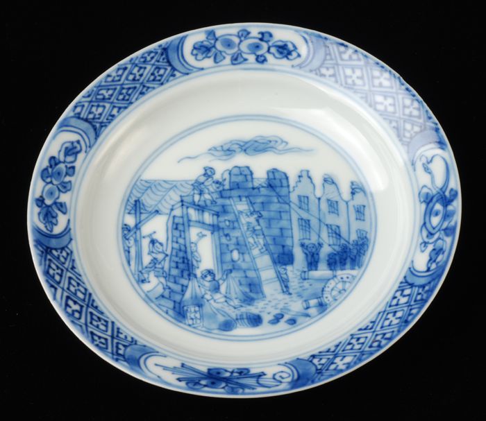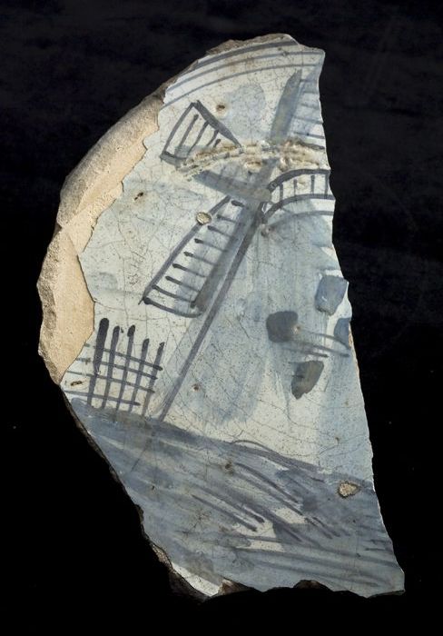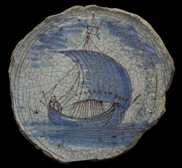 Blauw-wit fragment van majolicabord met afbeelding d...