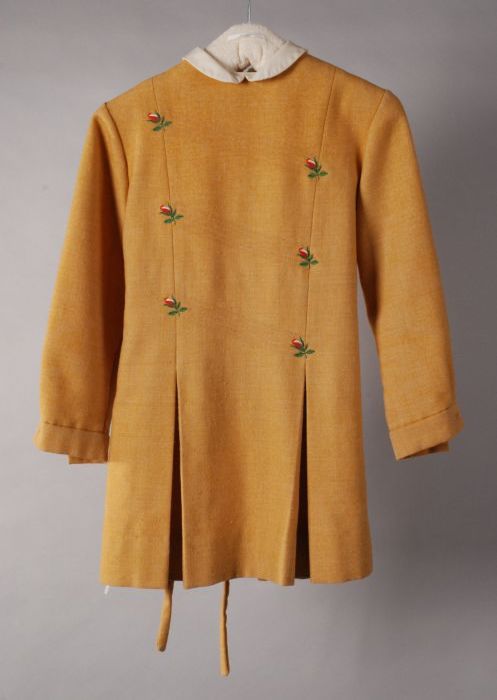 Kinderjurk van okergele keper, voorpand met schuine ...