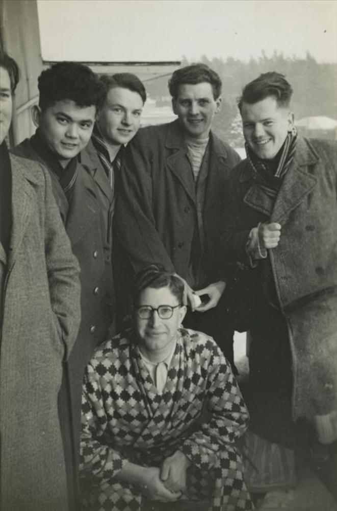 5 jonge mannen in overjas/kamerjas, Dekkerswald