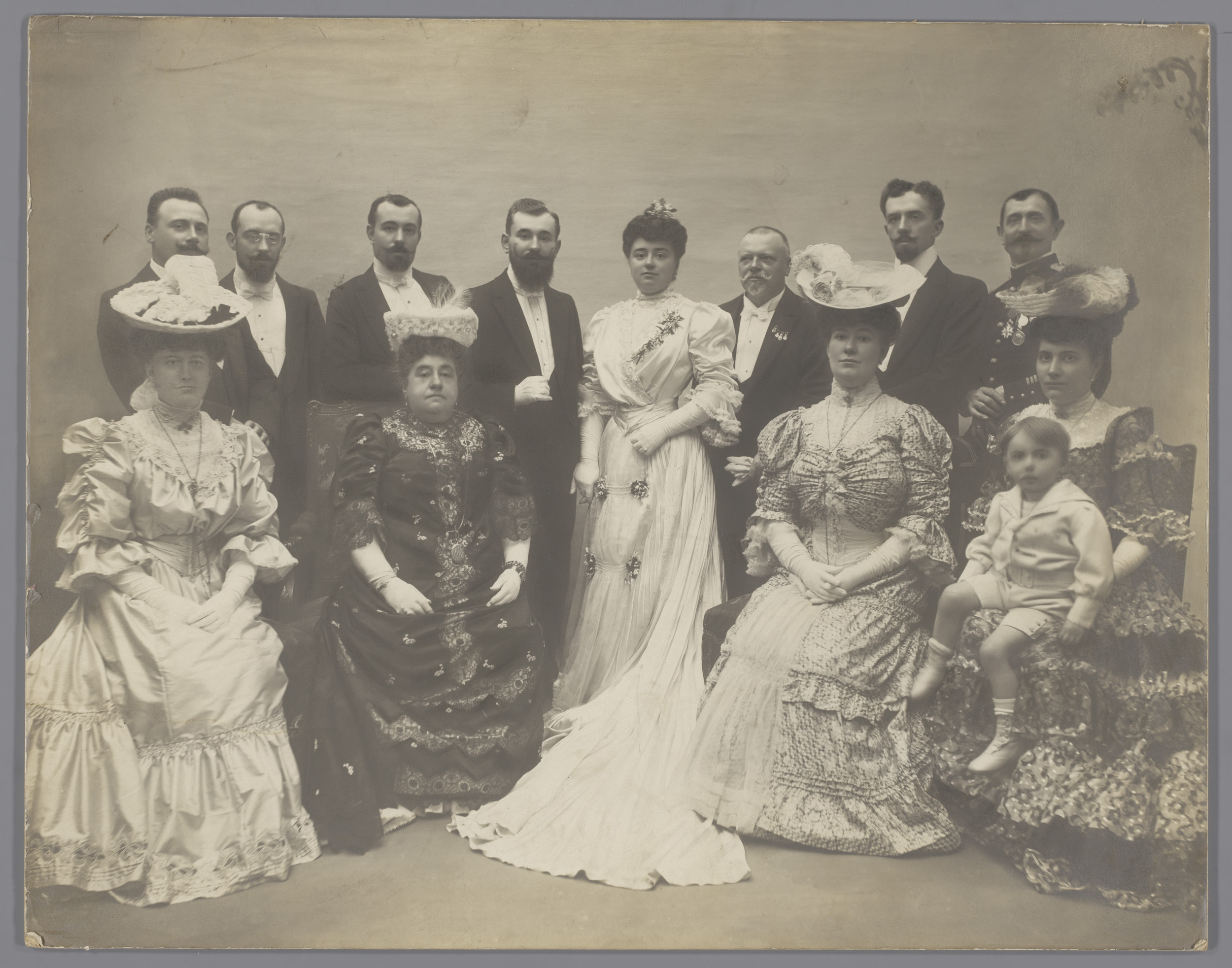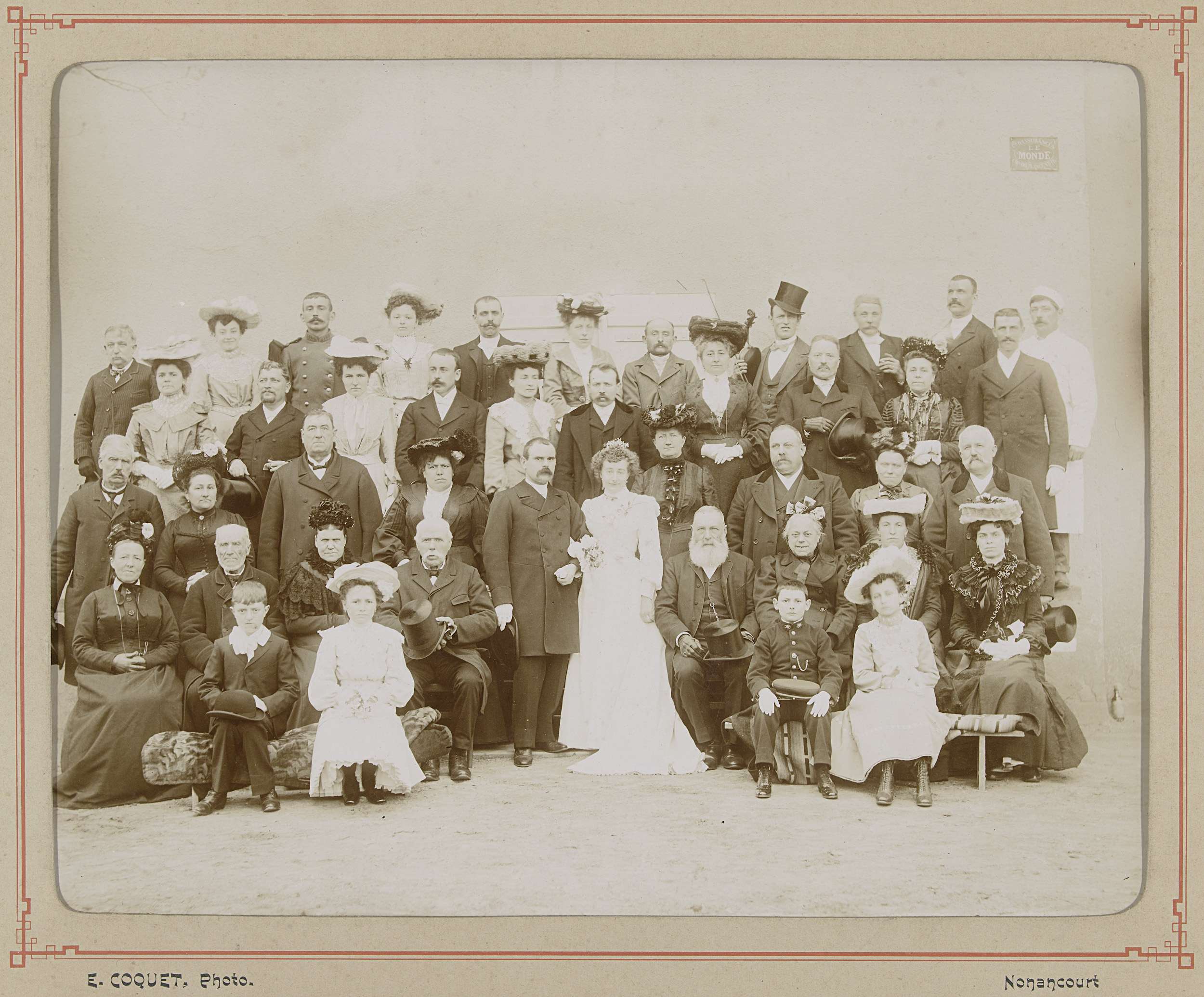 Groepsportret met onbekend bruidspaar in Nonancourt,...