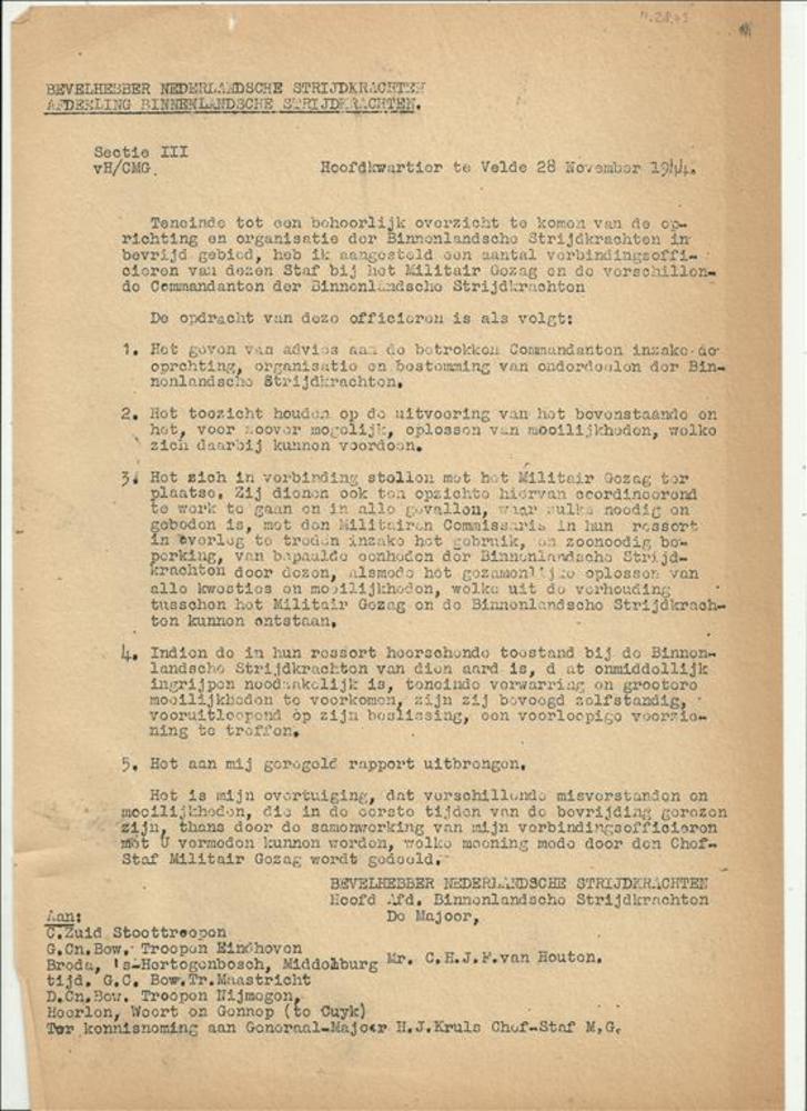 BNS van Houten aan Binnenlandse Strijdkrachten betre...