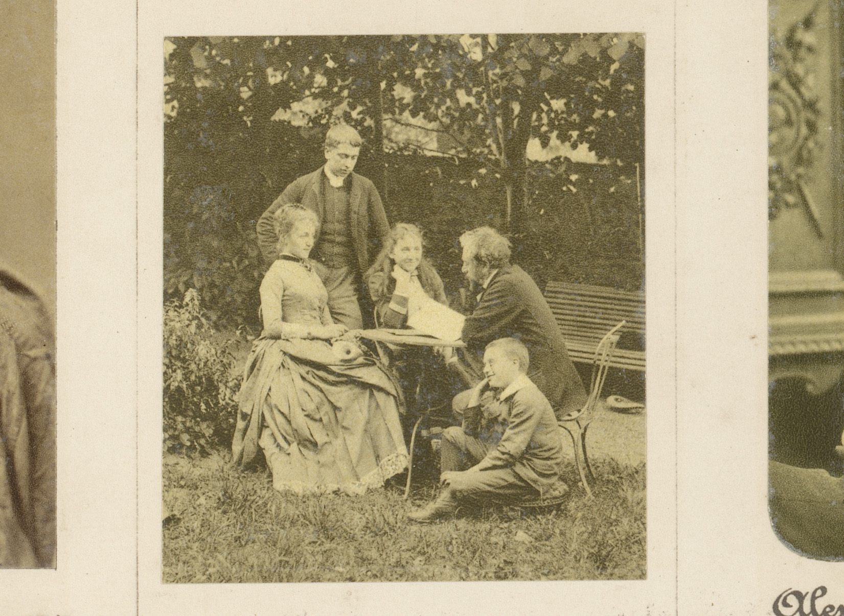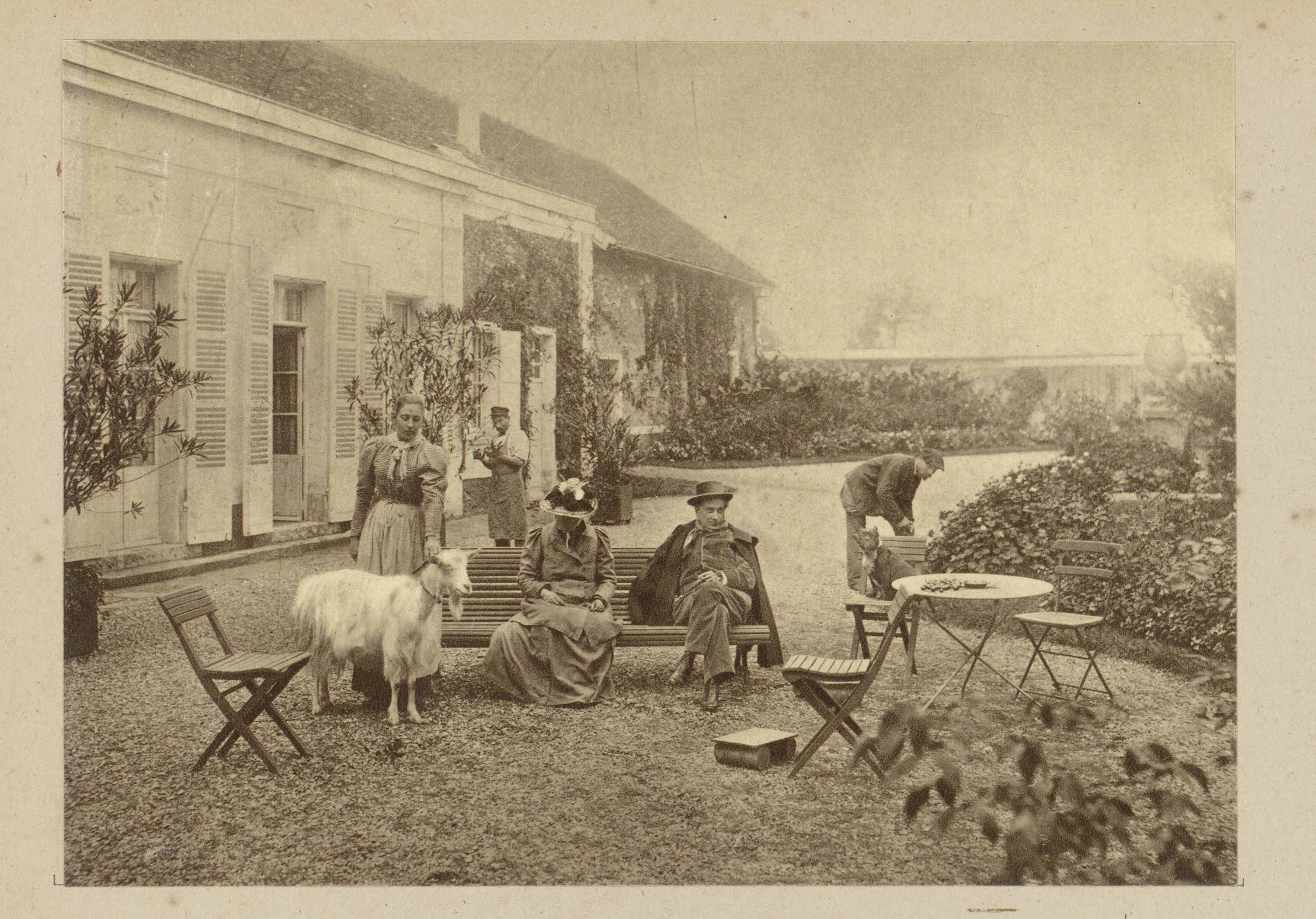 François Coppée met enkele tuinmannen en twee vrouwe...