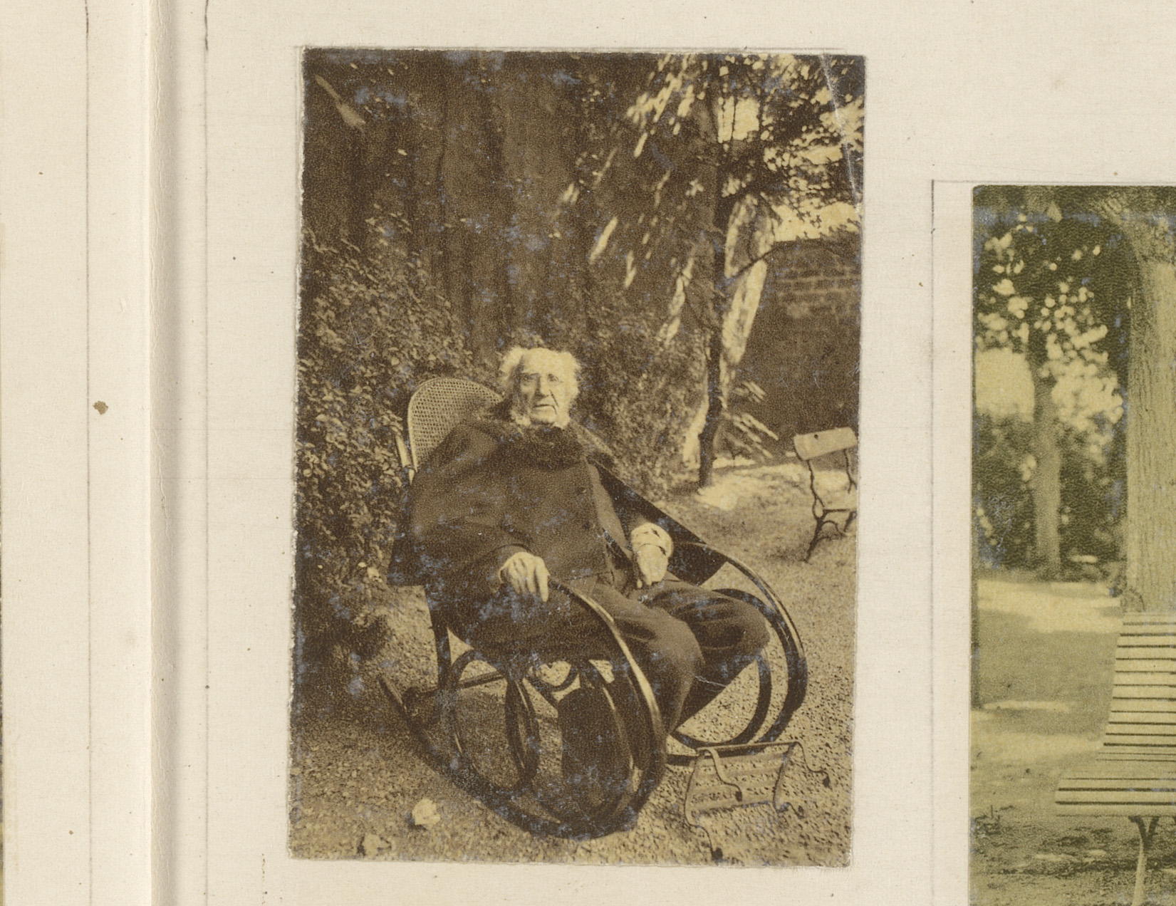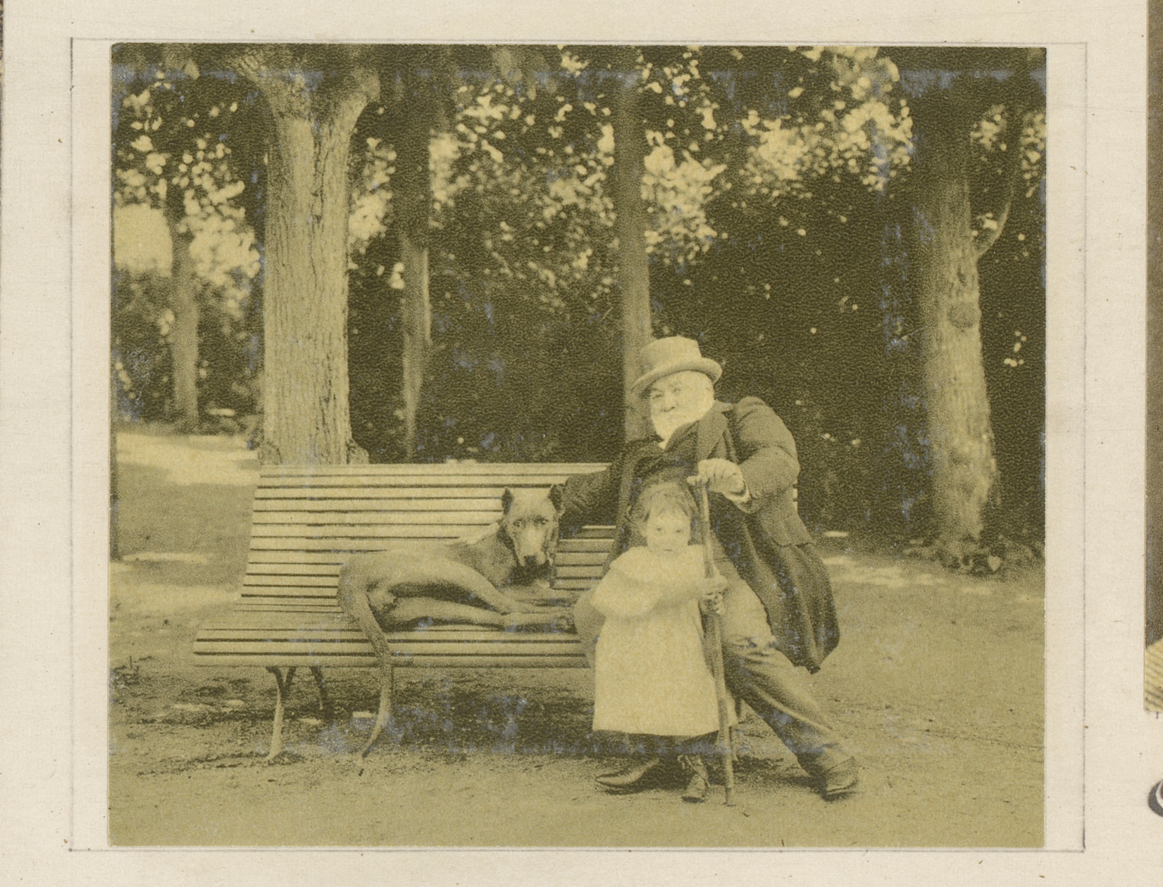 Francisque Sarcey met kind en hond op een parkbank