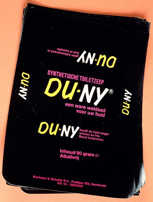 In papier verpakte "Du-Ny", toiletzeep, zwart, geel,...